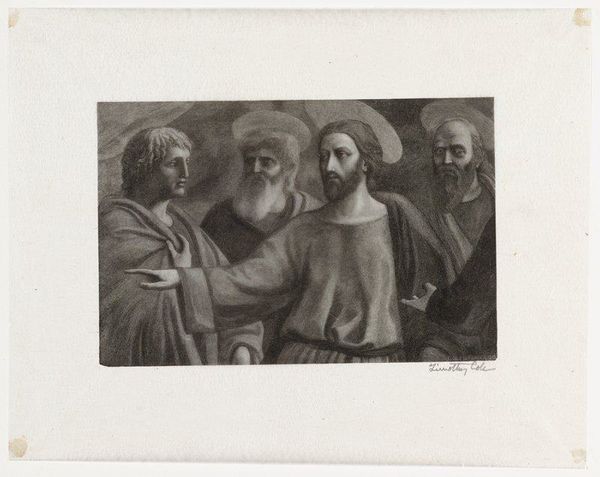 Editor: Here we have Friedrich Eduard Eichen's "Christ and the Adultress." It's a strikingly composed piece, and I’m immediately drawn to the contrast between the figures. What feelings or ideas does this engraving evoke for you? Curator: For me, it’s the quiet drama that hits home. Eichens captures that pivotal moment of grace, the averted gaze of the woman heavy with shame against the accusing stares. It reminds me that judgment is easy, but compassion? That takes guts. Editor: So, it's the emotional narrative rather than the technical skill that speaks to you most profoundly? Curator: Absolutely. It's that human connection, that sliver of hope in a sea of condemnation. Makes you think about our own biases, doesn't it? It's more than just ink on paper; it’s a mirror. Editor: That's a powerful perspective; it reframes how I see the whole scene. Curator: Art's funny that way, isn't it? Always whispering something new if you lean in close enough.