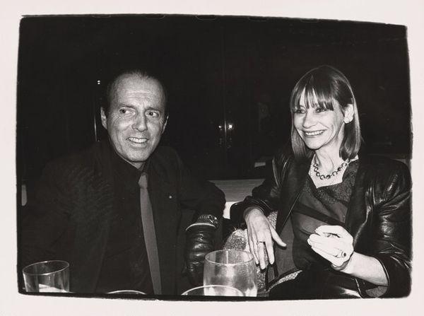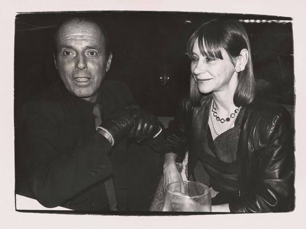 Editor: This is Andy Warhol’s gelatin silver print, "Neil Sedaka and Unidentified Woman", from around the 1970s. It has a candid, almost snapshot-like feel. What social commentary, if any, do you think Warhol might be making with a seemingly simple portrait like this? Curator: That's a keen observation. It appears simple, but Warhol's portraits often probe the cult of celebrity and its accessibility. He democratized portraiture, yet simultaneously critiqued the artificiality of fame. The 'unidentified woman' juxtaposed with Sedaka—what does this say about aspiration, access, and the transient nature of fame itself? What’s captured in this particular image that strikes you? Editor: The contrast is interesting. Sedaka is partially obscured by shadow, while the woman is brightly lit. Does the shadow perhaps represent fame’s darker sides, a kind of obfuscation? Curator: Precisely. Think about the historical context. Warhol was deeply embedded in social circles and navigated notions of what's valuable and visible in society. Do you see this interplay extending to aspects of gender within the image as well? The power dynamic implicit in who is seen, who is known? Editor: The woman seems positioned as almost clinging to Sedaka. Maybe there’s a statement here about the pressures on women to attach themselves to established male figures for validation or recognition? Curator: Absolutely, it invites us to question how gender, power, and fame intersect. Warhol, whether consciously or not, captures a dynamic that resonates far beyond a simple photograph. Consider, what conversations could this image start regarding women in creative spaces, back then and even today? Editor: I never considered all of these layers! I was focusing solely on the immediate visual. It’s so much more complex when seen through a sociocultural lens. Curator: And that's the beauty of art history—it’s a dialogue between what’s on the surface and the intricate web of social and political forces shaping our perceptions.