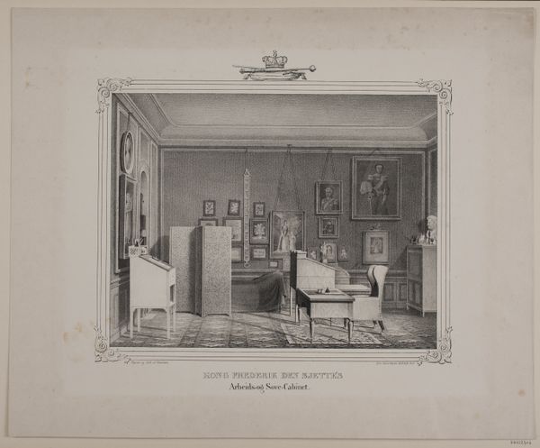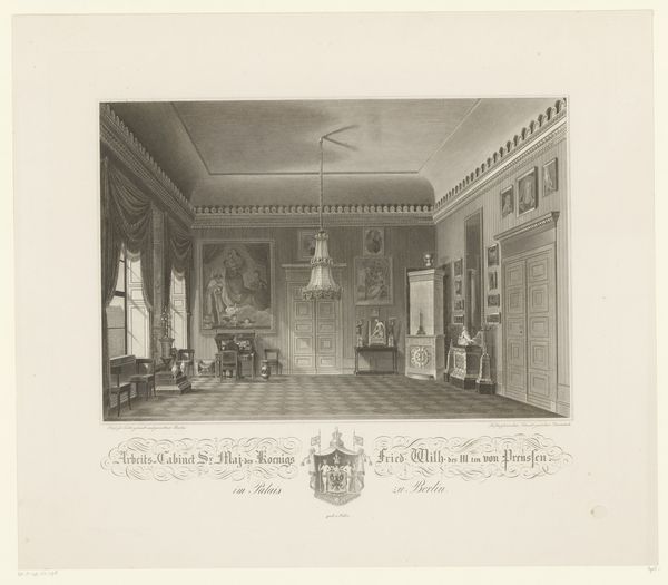 Richard Reeve’s aquatint depicts the library in St. James’s Palace in London, rendered with meticulous detail in shades of grey. The composition invites the eye to wander through the long, vaulted space, flanked by towering bookshelves and punctuated by classical busts. The aquatint medium lends a soft, tonal quality that evokes a sense of quiet grandeur. Reeve masterfully employs linear perspective to guide us through the scene. The receding lines of the architecture create depth and emphasize the library's vastness. The use of light and shadow enhances the three-dimensionality, giving the space a tangible presence. Note how the symmetry of the architecture is contrasted with the subtle asymmetry of the objects within, like the strategically placed ladder, disrupting any sense of rigid formality. This print not only documents a specific interior but also functions as a representation of knowledge, power, and order. The library, with its ordered rows of books and classical ornamentation, symbolizes the rational, enlightened ideals of the period. Reeve captures this architectural and intellectual order through his carefully constructed composition.