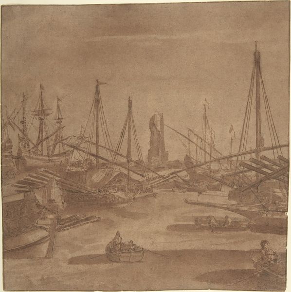 Curator: This is Claude Lorrain’s, "A Port Scene," created sometime between 1604 and 1682. The etching and drypoint print offers a glimpse into maritime life during the Baroque era. What's your first reaction to it? Editor: It feels quite serene, almost melancholic. The tonal unity lends a dreamlike quality, despite the very clear subject matter. There's a definite mood evoked, I wonder how it reflects societal perceptions of labor. Curator: Let's consider the artistic choices and labor behind it. The printmaking process involves significant craftsmanship, from the initial sketch to the etching and printing itself. The paper used, the ink, and the press - all these elements speak to a deliberate and complex method of production. How would such art impact perceptions around wealth and value during this period? Editor: Good point. Seeing ships, harbors, and maritime trade reflected European power during colonization, of course, but this artistic interpretation almost glamorizes the situation. What might those involved in the labor think, compared to the likely patrons of this print? Curator: Precisely! And beyond its subject, how might the dissemination of these images alter artistic tastes or market for artworks during this time? The affordability of prints meant they reached a broader audience and brought prestige. Editor: Absolutely. The city reflected here in A Port Scene looks classical in structure; what values is the artist, and the art form of print, therefore supporting? A system that also depends on slavery to function? Curator: Certainly worth noting that intersection. The composition is constructed carefully—a balance between land, water, and sky, the lines and shading suggesting the tactile qualities of the materials used. Editor: Yes, this makes me also think about power, knowledge, and commerce as interconnected and visually reflected here, as an ideal that leaves some people out. Curator: It is also fascinating to note how this print blurs the lines between art and craft and prompts questions about consumption. Thank you for providing new perspectives and showing what’s often overlooked. Editor: Thank you! Understanding art within the larger contexts is crucial for deeper awareness of history.