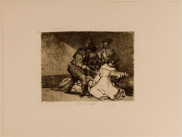 Curator: Goya's print, titled "They Don't Like It," immediately strikes me as a scene of intense struggle. There's a raw, almost brutal energy to it. Editor: Yes, look at that furious etching! The rough lines and aquatint give it such a visceral texture; I wonder what the metal plate endured to convey so much distress. Curator: The composition, for me, emphasizes the tension between the figures, that desperate embrace versus the aggression of the woman with the rock. I wonder what narratives Goya had in mind. Editor: I see it as a commentary on societal norms, perhaps the suppression of individual desires. The materiality speaks volumes: Goya used readily available materials, yet he transformed them into a critique of power. Curator: It's fascinating how the print almost whispers of the dark underbelly of human nature, wouldn't you agree? Editor: Exactly. It is a potent reminder that art isn't just about aesthetics; it's about the labor and the socio-political context embedded in every mark.