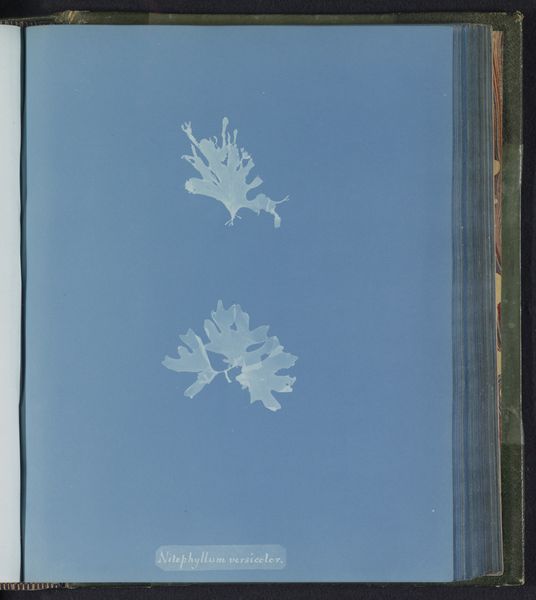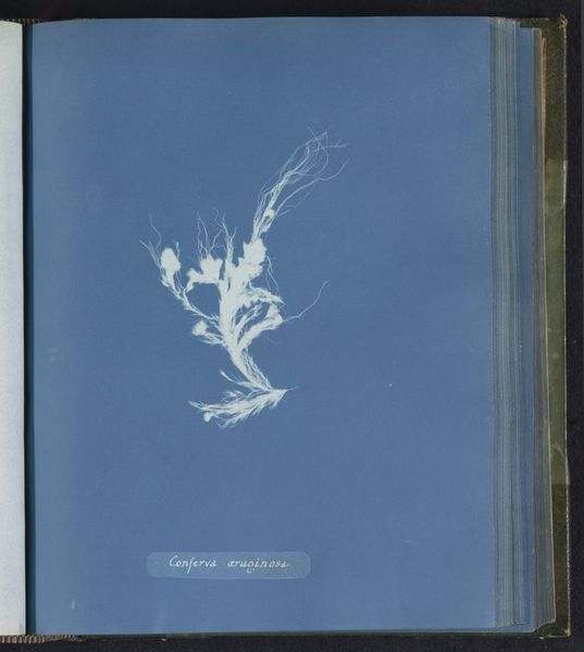Curator: My initial response to "Conferva floccosa", crafted sometime between 1843 and 1853 by Anna Atkins, is one of ethereal lightness. It’s like looking at a ghost on the page. Editor: A ghost conjured from the depths of the sea. Atkins created this print using the cyanotype process, a photographic printing technique that results in this distinctive cyan-blue hue. "Conferva floccosa" captures a species of algae, preserving its delicate form in almost otherworldly detail. Curator: The stark white against that intense blue… it evokes a sense of both scientific precision and something dreamlike. It feels connected to ancient mummification rituals, even to the burial shrouds used in my culture's history to conceal the unknown from the eyes. Editor: It's a powerful contrast. Visually, the composition has a structural simplicity. The form of the algae explodes, seemingly uncontained on the blue page but the framing shows just enough negative space that prevents it from overwhelming the composition. Curator: I wonder, looking at this, about the act of naming. “Conferva floccosa”—the very label anchors it, transforming something fluid and natural into an object of study, a defined entity within a larger system of understanding. Is it a preservation or control? Editor: You bring up a relevant consideration. Her use of photography for scientific classification aligns with that impulse. But at the same time, this specific process allowed Atkins to highlight form in a way that challenges that scientific eye. What seems fixed to one might represent endless freedom for others. Curator: It is a window into a different way of seeing, both scientific and deeply felt. It's not just a plant; it's an emotion rendered visible, an act of translation. Editor: And in its abstraction, it prefigures later movements in abstract expressionism—a striking interplay of chance and deliberate technique that bridges scientific inquiry and creative innovation. This particular piece stands on that artistic and historical threshold. Curator: I will think differently of seaweed after this. Editor: As will I. Thank you for helping me uncover new visual associations!