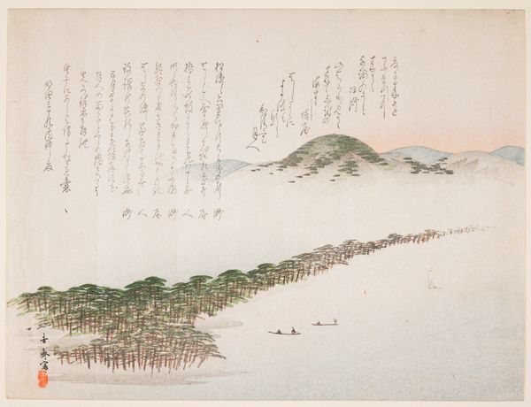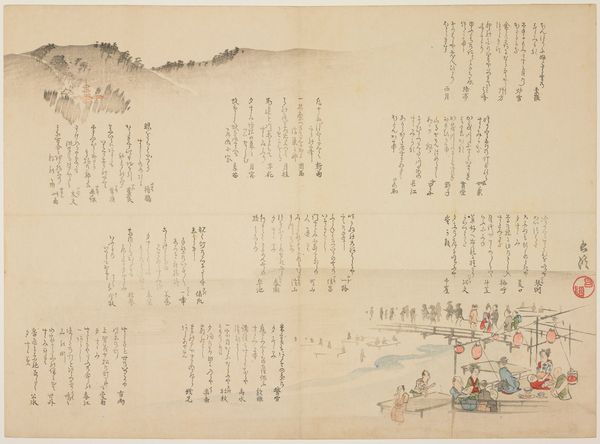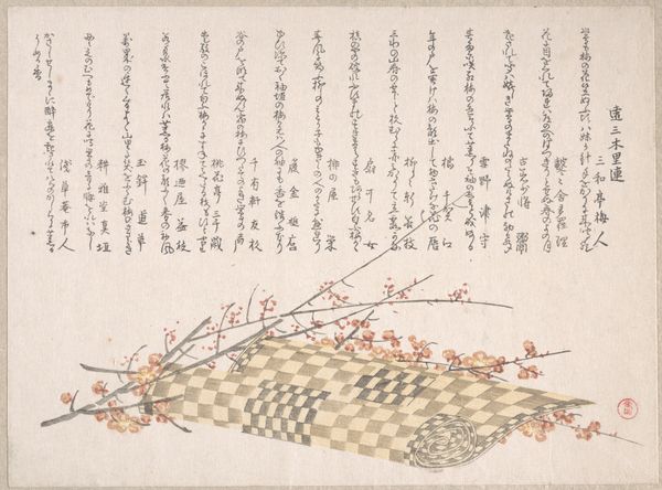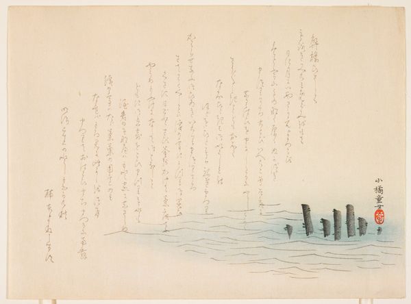 Curator: Let’s delve into this print, "Buckets and leaves floating," dating back to the first half of the 19th century by Nakajima Raisho. The delicate watercolor and ink work create a somewhat ethereal scene, wouldn't you agree? Editor: It does have a very dreamlike quality! The buckets floating on water alongside these almost scattered leaf-like shapes… What's your take on this, looking at it with your expertise? Curator: For me, the artwork invokes notions of transience and precariousness. Think about the historical context of the Ukiyo-e tradition, these “pictures of the floating world”. This era witnessed social hierarchies and rigid structures, yet art provided a space to question conventions. Does this river then become a metaphor for societal flux? How might the placement of text in this visual landscape inform that metaphor? Editor: I see what you mean. The buckets do seem vulnerable adrift in water. Considering it within the “floating world” idea adds another layer – as though it represents fragile existence itself. Curator: Precisely! We can view these floating objects, alongside the hand-drawn text, not as mere decorations, but as integral elements weaving together the artistic commentary. How might those elements be speaking about resistance and longing during that period? Editor: So, it's not just a pretty picture, it’s a commentary about identity, resilience, and society? Curator: Exactly! It asks us to contemplate those ideas in relation to gender, class, and cultural norms embedded in that period. Editor: That’s really broadened my view. I’ll definitely look at similar pieces with a different, more critical lens now. Curator: Fantastic. I hope that prompts others to consider this artwork beyond its visual simplicity, allowing them to question assumptions around art history and social dynamics.