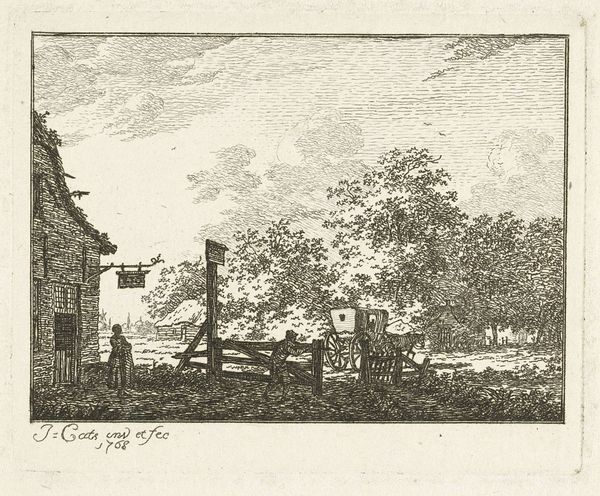 Jacob Cats made this print, Landschap met twee jagers langs de weg, in 1768, using etching. This intaglio printmaking technique involves using acid to cut into a metal plate, which is then inked to produce an image. The dense network of fine lines defines the tonal range of the bucolic scene. Note how Cats modulates the ink, and thus the viewer’s eye, creating a focal point around the hunters resting alongside the path, complete with their loyal dog. The natural landscape, rendered in careful detail, is offset by the more stylized clouds, which draw attention to the surface of the print. Landscape prints like this one, with their intricate details, were increasingly popular among middle class consumers. They provided a connection to nature and rural life at a time when both were rapidly changing, thus revealing wider issues of labor, politics, and consumption during the period. Appreciating the physical labor and skill involved in its creation encourages us to reflect on the dialogue between the artist and his materials.