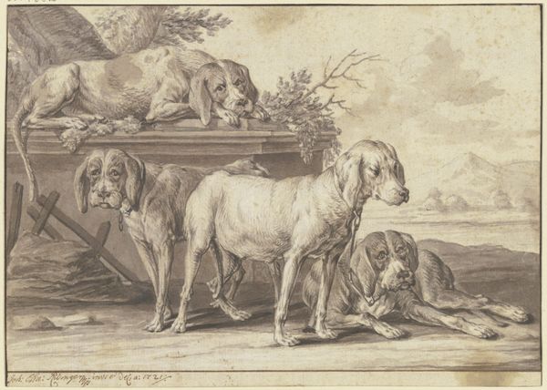 Curator: Welcome. We are looking at "Three Dogs," a 1793 etching by Martin Ferdinand Quadal. It's a very understated ink drawing with a quiet landscape sketched in behind the dogs. Editor: Yes, there's an almost melancholic feel to it, isn’t there? The muted tones and soft lines, particularly around the reclining dog, evoke a sense of weariness, even vulnerability. Curator: Absolutely. The presence of dogs as symbols extends back millennia, frequently representing fidelity and protection. Within various cultures and mythologies, dogs have been guardians of both the domestic space and the spiritual realm. The posture of the dogs might point us to a shift of this historical interpretation. Editor: I agree. Looking at the composition, there’s a stark contrast. Two of the dogs are upright, but their gaze isn’t necessarily confrontational. The one lying down seems burdened, almost defeated. Dogs throughout art history have represented status and hunting prowess, especially within aristocratic circles, but is this etching suggesting a questioning of those power dynamics prevalent at the time of its creation? Is the weary dog symptomatic of broader social unrest? Curator: That’s a very compelling read. It pushes us to consider the etching not simply as a quaint pastoral scene, but a subtle commentary. Editor: And considering Quadal was working during a period of immense upheaval – the French Revolution was in full swing – it's hard not to see potential allusions to social burdens and a longing for rest, for peace. Curator: Indeed. The landscape too feels sparse, not exactly bountiful. The artist subtly integrates traditional symbols into the social landscape of that era, inviting us to see them with new eyes. Editor: Ultimately, it’s a remarkably delicate piece that uses the imagery of these domesticated animals to prompt consideration of the broader human condition and, possibly, to challenge social structures. Curator: I appreciate how the print resonates with complex issues using seemingly simple subjects, enriching our comprehension of art’s continuing cultural relevance. Editor: Exactly! These enduring depictions offer so much meaning through generations, questioning, confronting, and even helping heal society over time.