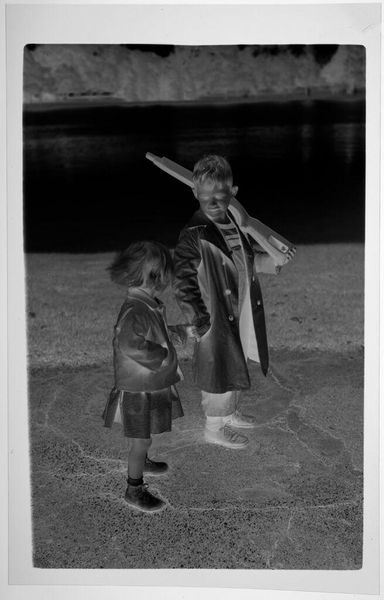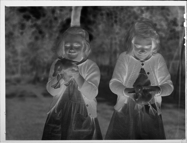 Editor: Here we have an untitled photograph by John Howell, showcasing two little girls beside a sandbox. The high-contrast negative seems to give this otherwise charming scene a slightly eerie feel. What's your take on it? Curator: Well, sometimes the most unsettling images burrow their way into our memories the deepest. This photograph, with its ghostly, inverted tones, whispers of forgotten childhoods and the bittersweet passage of time. It reminds me of trying to recall a dream, the details fading even as you grasp for them. Do you feel that sense of something just out of reach? Editor: Yes, I do. Thank you, it helps me to see it in a new light.