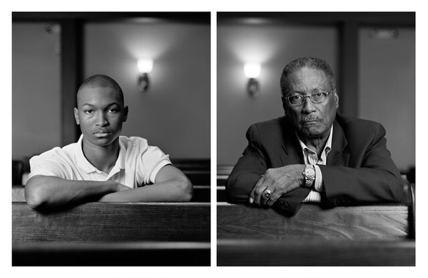 Dawoud Bey made these gelatin silver prints of Betty Selvage and Faith Speights. The diptych composition is split into two portrait images, each carefully framed to create a balanced, symmetrical effect. The tonal range of the black and white emphasizes textures, from the fine lines of Betty’s tailored jacket to the subtle sheen of Faith’s blouse. The subjects' poses mirror each other, which is accentuated by the identical chairs they occupy. This use of repetition creates a visual rhyme that encourages a comparative reading of the sitters. Bey’s formal approach invites us to consider the interplay between individual identity and social role. The backdrop of a blurred landscape painting adds depth without distracting from the subjects. The choice of black and white emphasizes the timelessness of the portrait. This is further enhanced by the meticulous composition, drawing attention to the details of posture and dress, imbuing the figures with dignity and presence. The framing of each print completes the visual structure of the artwork, inviting a deeper reflection on representation, identity and the art of portraiture.
