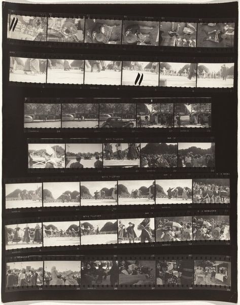Curator: Robert Frank created this intriguing contact print, titled "Family 6", around 1960. What's your initial read on it? Editor: Immediately, I see a rhythmic composition, almost musical. The grid of images provides a compelling structure, and the tonality shifts create a fascinating ebb and flow, guiding the eye across the entire surface. It's the filmstrip itself, not individual images, that speaks first. Curator: Right, a powerful arrangement! And on closer viewing, those individual scenes feel like snippets of Americana. It evokes post-war values and the romantic family idea. Frank was capturing moments, making us question what they mean in the bigger picture. The film's edge markings also add a documentary layer. Editor: Indeed, that material reality disrupts the purely representational aspect of the images. And there's tension there. Look at how some shots are blown out, overexposed, some nearly missing, like incomplete memories. Is that carelessness or commentary? Curator: Could be intentional or coincidental; perhaps a mix. This lends itself to interpretation as a visual poem about memory and fragmented experience. Do you find the light areas almost ghost-like, haunting those tangible family shots? Editor: Absolutely. The overexposure performs as a visual absence, forcing us to contend with the negative space within the work itself. Almost like an act of deconstruction through photographic means, asking what's concealed beneath the family ideal. Curator: It's this dance between revelation and concealment that makes Frank so compelling. We're reminded how identity gets molded by social factors, yet intimate experiences are deeply personal. Family as institution but also sanctuary. Editor: Well, I appreciate how the repetitive pattern of this contact sheet ultimately directs us away from seeking narrative cohesion and into contemplating the nature of visual media itself. The sequence asks, what's actually worth remembering, and why? Curator: Exactly, this pushes our consideration far beyond a family album. It allows viewers to access collective histories and unconscious symbolism, reminding us of shared vulnerabilities. Editor: An impressive combination of formal constraint and visual probing.