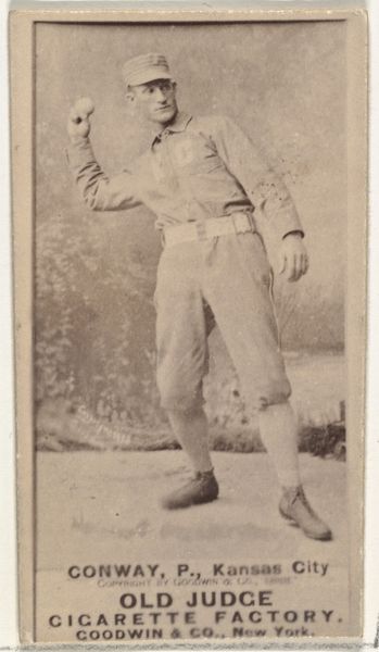 Curator: This is card number 157 from the Actors and Actresses series, circa 1880s. It features Gracie Wilson and was produced by Duke Sons & Co. as a promotional item for Duke Cigarettes. What strikes you first? Editor: An immediate sense of ambiguous gender expression. Gracie is rocking this almost dandyish, yet oddly boyish, ensemble...like a proto-Marlene Dietrich in breeches. But then you get the overall "selling cigarettes" vibe—there's definitely an interesting duality here. Curator: Absolutely, it is worth remembering that publicity was often considered outrageous at that time and therefore successful. So there is the idea of liberation attached, though what is really being offered is nicotine addiction. It's an albumen print, a very common photographic process then. Does that particular process spark anything in your readings? Editor: Oh, yes, albumen prints… They give the image a unique kind of warmth, almost a golden luminescence. And you’re right – they were wildly popular for carte-de-visite portraits like this. The Victorians were really into collecting these sorts of images of public figures. Gracie must have been very popular indeed to warrant a trading card in a tobacco pack. Curator: What kind of character might she play on the stage, do you think? Her gaze seems to invite adventure and transgression. Her slight smile seems to whisper, "dare to defy expectations". It almost makes me feel slightly nervous, or intimidated. Editor: I would say that confidence seems to be her best garment! It could also be interpreted as being rather blasé, and in any case her costume feels allegorical. Is it not curious to dress up a women in mans clothing to get her seen, but on the understanding that the costume may then be understood in a way that makes it not masculine at all? Curator: Nicely put, it definitely feels designed for a certain gaze. Perhaps it is simply the fact of performance. So the act is just a costume of confidence! This image really captures the zeitgeist. Editor: In the end, this photograph, like so many others of the era, speaks volumes about Victorian attitudes towards gender, celebrity, and even consumerism. Thank you, Gracie! Curator: Yes, I am taking away a lot more than I expected from such a small image! Another cultural seed well worth growing.
