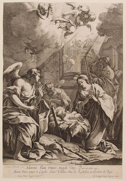 Editor: This print, Carlo Borromeo Administering the Communion to the Plague-stricken by François de Poilly the Elder, is strikingly dramatic. The scene of suffering is so visceral. What can you tell me about the socio-political context of this image? Curator: This print showcases the public role of the church during times of crisis. Borromeo's act of giving communion highlights the church's authority and presence amidst chaos. How does the artist use imagery to convey this message of power and service? Editor: I see that Borromeo is the only figure in full light, set apart from the suffering masses. It's definitely a strategic choice. Thanks for pointing that out! Curator: Absolutely. Understanding art involves examining how institutions shape our perceptions and beliefs. It's been a pleasure discussing this with you.