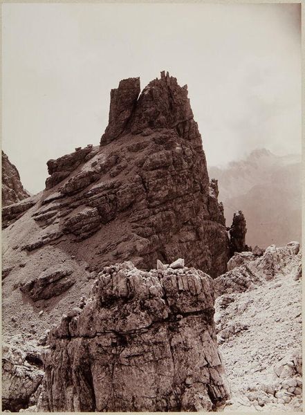 Editor: This is "Tofana di fuori, Zillerthal" by Vittorio Sella. It's a photograph, and I'm immediately struck by the stark contrast between the rough, textured mountain and the soft, cloudy sky. What formal elements stand out to you in this image? Curator: The photograph's strength lies in its stark geometry. Note the contrasting diagonal lines of the mountain face against the horizontal bands of geological strata. The lone figure serves to emphasize the scale, creating a dialogue between nature’s grandeur and human presence. Editor: So the human element acts as a formal tool to emphasize the mountain's form? Curator: Precisely. The formal structure emphasizes the mountain's scale and texture. The photographer seems less interested in the individual and more in their relationship to the landscape. Editor: That's a perspective I hadn't considered. I was focused on the subject, but seeing it as a play of lines and scale gives it a new dimension. Curator: Indeed, it's through this interplay of form that the photograph achieves its power.