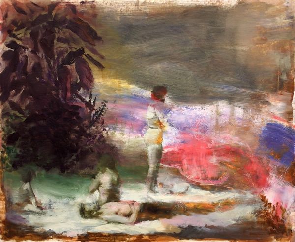 Editor: This is Joshua Flint's "Opening Night," painted in 2019 using oil paints. It gives off such a dreamy, almost theatrical vibe with those two figures perched on the branch. What's your interpretation of it? Curator: It's interesting you picked up on the theatrical aspect. For me, "Opening Night" evokes the feeling of a memory, slightly out of focus, filtered through personal experience. Notice how Flint uses a blend of realism and something akin to neo-expressionism, layering different styles like transparent curtains. It almost feels like peeking into a half-remembered dream, doesn’t it? What about the composition stands out to you? Editor: The blurred faces, maybe? They make the figures seem anonymous, almost universal. It's like they could be anyone, or everyone. And those floating orbs of light—are they symbolic? Curator: Precisely! Those blurred features invite us to project our own stories and emotions onto the figures. As for the orbs, they could be interpreted in various ways - as stage lights, perhaps, or bubbles of memory, or even abstract representations of hope and anxiety inherent in "opening nights" both literal and metaphorical. I keep wondering about the artist and his choices - it feels intensely personal and yet strangely remote. Editor: I see what you mean! It is like we are watching someone else's memory playing out. Curator: It makes me ponder on this: how do we distill our life experiences and reframe them through art? Perhaps by blurring some details and spotlighting others. Editor: I never thought of it that way. Thanks for opening my eyes! Curator: The pleasure was all mine! It's exciting to share a personal moment with others in artwork.