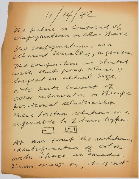 Curator: This is Stuart Davis's "Art Theory Text with Configuration Diagrams." It’s undated, but we know it was made in 1942. What strikes you about it? Editor: I find it interesting that it's not necessarily a painting, but rather a page filled with the artist's handwritten notes on color and form. What do you see in this piece? Curator: I’m drawn to the text itself. Davis is concerned with the material impact of color relationships and how these relationships generate meaning. He emphasizes the active construction of patterns through the juxtaposition of colors. How does this handwritten element affect your understanding of his work? Editor: It makes me think about the labor involved in artmaking, even the conceptual labor. I hadn't considered that. Curator: Exactly. It challenges the traditional idea of artistic genius. Editor: I see that now! Thanks for pointing that out.