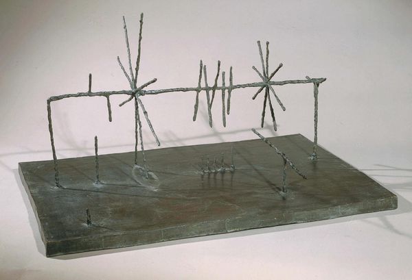 Editor: We're looking at Bethan Huws' "Boats," a mixed media piece residing in the Tate. The contrast between the delicate boats and the sturdy wooden table it's displayed on is striking. What do you see in this piece from a formalist perspective? Curator: Notice how the composition is arranged; the boats are distributed, yet there’s a repetitive, almost rhythmic quality. The glass case both isolates and elevates the work. How does this layering and separation affect your perception? Editor: It makes me more aware of the materials—the wood's grain, the glass's transparency, the boats' fragility. Curator: Precisely. Huws uses these contrasts to explore the inherent qualities of each material. The juxtaposition highlights the formal relationships within the sculpture. Editor: That makes me see the artwork in a different way, and better appreciate the relationship between the materials. Curator: Indeed, focusing on such interplay opens up a deeper understanding of the artist’s intention.