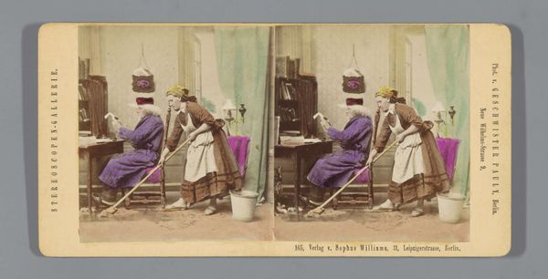 Curator: Before us is “Twee kinderen spelen in een huiskamer” (“Two Children Playing in a Living Room”), a photograph by Sophus Williams, taken around 1880. Editor: Immediately striking is the muted palette, which almost lends it the quality of an early colorized photograph. The arrangement of figures and objects creates a balanced, almost symmetrical composition across both scenes, lending a rather studied air. Curator: I'm immediately drawn to the implications of 'genre-painting’ written on the piece. The image invites us to consider not just childhood innocence, but the socially constructed roles being rehearsed in the children's play. The toys scattered on the floor read almost as symbolic props in a theatrical production. Editor: Precisely. Note how the toys - the drum, the horn - lie discarded, mere supporting elements for the more significant narrative between the figures. The girl stands with taut string, the boy sits entangled in the game; a visual metaphor for the ties that bind and the constraints they represent. Curator: It speaks volumes about the dynamics of power. What games are these children playing and who decides its rules? Whose future is written on these walls in gilt edging and fussy wallpaper? Editor: Agreed, and look at the stark difference in their engagement! The girl has this straight posture, facing straight ahead, unlike the boy tangled up on the string. But beyond societal implications, the very staging, the repetition from image to image, turns photography itself into a theatrical medium, almost Brechtian in its distancing effect. Curator: A provocative thought! Considering the period, how might this "realism" reflected—or deflected from—contemporary debates around the ideal childhood? What are the ways the staging subverts or perpetuates gendered expectations within the domestic sphere? Editor: So, while it's undoubtedly fruitful to view this scene as a microcosm of broader social dynamics, let's not dismiss the formal rigor evident in the image construction. Curator: A good point. Thanks for your formal eye and insight. This work speaks to not just societal dynamics of its era but how it visually communicates this tension. Editor: Indeed, its layered artifice underscores a constant interplay of social, and aesthetic tensions which resonates even now.