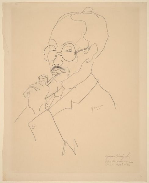 Editor: This drawing is a portrait of Yasuo Kuniyoshi by Aline Fruhauf, from around the 1930s. It's a fairly simple sketch, but there's something captivating about the angularity of the lines and the flatness of the forms. What strikes you about this work? Curator: The drawing's strength resides precisely in this linear quality and formal economy. Notice how Fruhauf constructs the portrait almost entirely from simple geometric forms – cylinders, rectangles, and arcs. It appears modernist. How does this simplification contribute to the overall reading of the portrait, in your opinion? Editor: It definitely makes it more abstract and less focused on realism. I think that the shapes, like the circles of the glasses, create visual anchors, points that make the viewer's eyes jump across the piece. The negative space is very prevalent. Curator: Precisely! The figure is contained within the shapes, there is a balance and the artist plays with the interplay of positive and negative space to define the form. Look at the harsh vertical lines used for his cheek. How does the lack of traditional shading inform our understanding? Editor: Well, it almost flattens the picture plane, making it harder to discern volume or depth. The emphasis isn't on making him *look* real, it’s like she is capturing just his essence. Almost like a caricature. Curator: Yes, exactly! So it becomes less about capturing an exact likeness, and more about representing him through stylized formal elements. It really reduces the face to line and shadow. There's no illusion. I appreciate this purity of form. Editor: I agree! I didn't appreciate that tension before. Thank you. Curator: My pleasure. Examining the relationship between the abstract and the representational reveals Fruhauf's sophisticated understanding of modernist visual language.