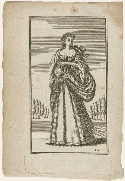 Editor: Here we have a standing portrait of an unknown queen, an engraving by Philips Galle dating sometime between 1547 and 1612. She looks very self-assured, but there is something intriguing in the lack of information about her. How do we interpret this portrait without knowing her identity? Curator: That anonymity is key. Portraits of rulers were rarely just about capturing a likeness. They were potent symbols. This engraving would have circulated widely, shaping perceptions of power. The lack of specific identity allows for broader application, doesn't it? Perhaps an archetype of queenship? Editor: Yes, she certainly embodies an idea of regal authority. The crown, the luxurious fabrics, even the background landscape contribute to that impression. Do you think the artist intended this to be more symbolic than literal? Curator: Undoubtedly. Consider the historical context. Printmaking enabled the mass distribution of images, including those of royalty. But these weren't neutral depictions. Galle, like many printmakers, was essentially in the business of constructing a brand, shaping public opinion through carefully crafted imagery. How does that impact our understanding of its authenticity? Editor: That makes a lot of sense. So, the portrait becomes a kind of political statement? Curator: Exactly! It's less about historical accuracy and more about conveying ideals and asserting authority in a visual language that would be understood and circulated. It makes me wonder, who was the audience for a piece like this? Editor: Understanding the queen as an idea, and not necessarily as an individual, shifts the way I view her entirely. Curator: And it helps us recognize how art is so often implicated in larger historical narratives of power and perception.