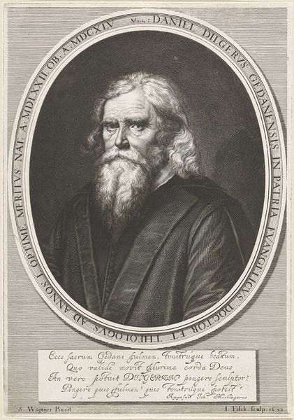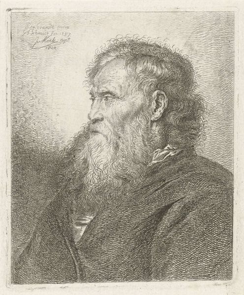 Editor: Here we have "Portret van een oude man met baard", Portrait of an Old Man with Beard, made in 1824 by Johannes Mock. It's an engraving, currently held at the Rijksmuseum. The detail is just amazing! What really strikes me is the layering and how much depth Mock creates just with lines. What elements stand out to you? Curator: Indeed. Note the sophisticated use of line – a network of hatching and cross-hatching meticulously defines the form. Observe how the density and direction of these lines sculpt the planes of the face, lending it volume and texture. Also, let's consider the economy of means here. How would you describe the function of negative space in composing the portrait? Editor: Well, it keeps the portrait from feeling too busy, even though the lines are so intricate. It also emphasizes the light catching on his face and beard. Curator: Precisely. Now consider the formal interplay between the textured surfaces - the beard, the hair - and the smoother areas of the face and the simple dark robe. How do those juxtapositions shape our reading of the work? Editor: I guess the textures draw my eye to those specific areas. They feel more dynamic compared to the smoother parts. Curator: The variations in texture provide not only visual interest, but contribute to a deeper understanding of the artist's mastery over their medium and create an aesthetic harmony of contrasting features. Thinking formally helps me appreciate the deliberate nature of each mark. Editor: I see what you mean! Paying close attention to just the lines, shades, and the balance definitely makes me see the artwork with fresh eyes!