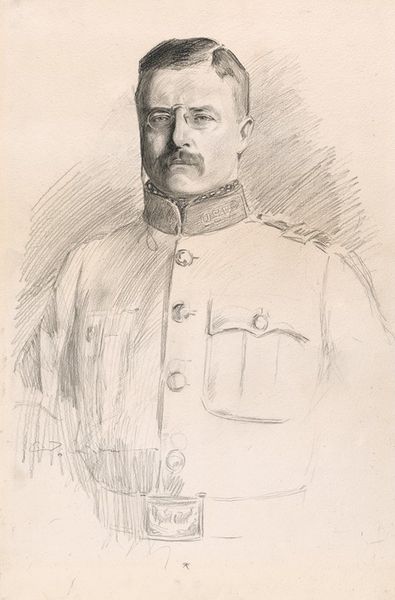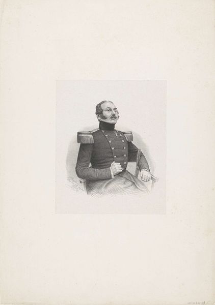Curator: Before us hangs a rather stately graphite drawing titled "Portret van een onbekende man", attributed to Johann Peter Berghaus, possibly from 1866. Editor: It feels serious, almost a bit… burdened. The sharp details in his uniform are remarkable, especially considering it's just graphite. It almost feels like peering into a very meticulously kept memory. Curator: Exactly. Berghaus was a skilled portraitist, focusing particularly on the emerging bourgeois class and military figures, suggesting notions of status and visibility. The choice of graphite itself is significant; it's a readily available and relatively inexpensive material, reflective of the democratization of portraiture during that period. Editor: It makes you wonder about the accessibility of art, even then. Was graphite chosen for its affordability or aesthetic qualities, or maybe both? The sharp lines make the clothing stiff, almost regimented. Curator: I’d argue that's intentional. Notice the detail in the buttons and embellishments, indicating social standing and military authority. Consider the paper it's drawn on – likely mass-produced. The use of those readily available materials would influence not just the price point, but its portability and function. This drawing wouldn't hang in some aristocratic palace; its role was quite different, perhaps functioning as an affordable family memorial or sentimental keepsake. Editor: It's less about timeless grandeur, more about a tangible record of someone, somewhere. It connects me with a sense of humanness and reminds me we are more connected to each other by objects than we know. Curator: A pertinent reflection. And indeed, through examining such elements we begin to piece together the lives connected to the making and viewing of this very artwork. Editor: This humble graphite portrait reveals a lot about artistic and societal shifts; something accessible yet potent.