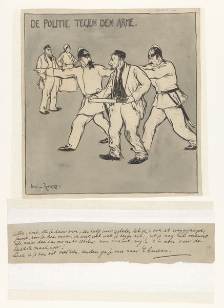 Joan Robbers created this political cartoon titled 'De politie tegen den rijke' using ink on paper. The composition is strikingly divided into two distinct zones—the upper scene and the lower text—inviting a comparative reading. The visual narrative unfolds with bold, expressive lines that capture a moment of confrontation. Notice how the artist uses stark contrasts and dynamic angles to portray the tension between figures who represent authority and those who symbolize wealth. This conflict is rendered with a sense of theatricality, as if staging a critique of power dynamics. Consider how Robbers employs caricature and exaggeration to amplify the social commentary. The formal elements—line, composition, and the exaggerated features—work together to destabilize traditional representations of authority and wealth, prompting viewers to question established social hierarchies.