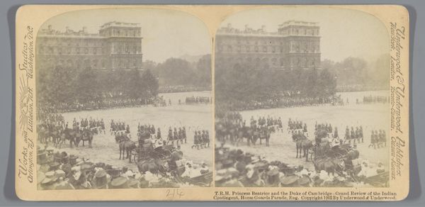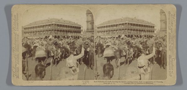 Editor: This photograph, entitled "Gezicht op het Kerkplein tijdens de capitulatie van Pretoria...", so "View of Church Square During the Surrender of Pretoria," dates back to the early 1900s. It's a gelatin silver print depicting Lord Roberts' troops, and the sheer scale of the crowd in contrast with the emptiness of the square strikes me as unsettling. How do you read this piece? Curator: From a formal perspective, consider the deliberate composition. The photograph is structured with strong horizontal lines created by the rows of soldiers and the buildings in the background. Notice the limited tonal range – a palette dominated by sepia. The almost monochromatic quality serves to flatten the image, emphasizing the geometric patterns created by the arrangement of bodies. It’s about capturing a sense of order, of imposed structure. How might you interpret the use of realism within this construct? Editor: Perhaps the realism juxtaposes the emotional distance inherent in its form? Curator: Precisely! The sharp, clear depiction offers factual representation. This photograph doesn't tell a story, instead capturing an imposing moment of structured, organized power. Consider how the materiality of the print itself—the specific texture and tone achievable with gelatin silver—contributes to this overall reading. Is this an effective application of Realism? Editor: Well, I do feel that by documenting such grandness in a Realist style makes the soldiers feel more powerful, and like a force to be reckoned with. Curator: It invites a critical engagement with the photograph’s message beyond simply documenting an event. By exploring these formal elements, we gain a more nuanced understanding. Editor: I hadn't considered the interplay between its composition and what the photo seems to convey! Thanks for sharing your insights!