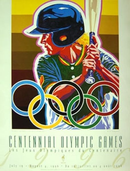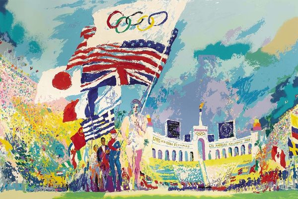 Editor: So, this screenprint is called "Basketball" by Hiro Yamagata. It looks super vibrant. All the colors are so saturated and the figures almost jump out at you. With those rings in the background, it makes me think of the Olympics. What kind of statement do you think the artist is trying to make? Curator: Well, those five rings are unmistakable as the Olympic symbol. Circles, historically and across many cultures, signify unity, wholeness, and the eternal. Think about wedding rings, or mandalas. In this context, they represent global athletic unity, but Yamagata complicates that a bit. Editor: How so? Curator: The basketball player is intensely focused, straining for victory. The overall image has that joyful "pop art" feel, but the competition aspect introduces tension. The tension of striving for excellence, the pressure of representing your nation, it’s all captured within the image. Consider also, how the colors add meaning; the red figure, could signify sacrifice or energy, the yellow bolts could evoke the lightining speed of the game. Editor: So the artist juxtaposes universal harmony of the rings with the more aggressive energy of the sport? Curator: Precisely. Also, sport itself becomes symbolic, reflecting dedication, physical prowess, and the spectacle of human achievement, don't you think? These players become heroes within their arena. And Yamagata invites us to contemplate the many layers of meaning behind these powerful visual emblems. Editor: That makes a lot of sense. I was initially drawn to the bright colors, but now I see all these deeper symbolic layers. Thanks, that was great. Curator: My pleasure! It is so interesting to uncover the different cultural meanings carried by simple images.