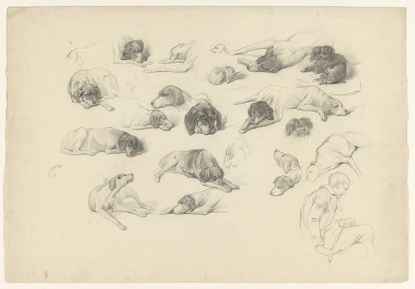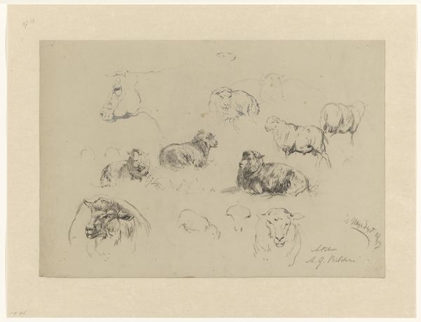 Editor: We’re looking at Willem Maris’s “Studies van koeien, een kalf een een paardenhoofd,” dating from 1854-1910. It’s a pencil drawing on paper, with various animal figures scattered across the sheet. There’s something so immediate about this piece – almost like we're seeing into the artist’s sketchbook. How would you interpret this work from a formal perspective? Curator: Notice first the tonal range Maris achieves using solely pencil. From the almost imperceptible grazes constructing the atmospheric background, to the intensely shadowed contours that define the animals' musculature, the artist orchestrates a subtle yet dynamic visual field. How does the dispersal of forms across the picture plane affect your reading? Editor: It feels incomplete, somehow. The figures aren’t interacting, and the composition feels a little random. It lacks a certain…cohesion, perhaps? Curator: Precisely. But is that incoherence a flaw, or is it a calculated aesthetic choice? Consider the very *act* of studying, which is inherently fragmented. These aren't portraits; they're investigations into form and light. Maris directs your eye not through narrative, but through a shifting distribution of weighted masses. Semiotically, the pencil itself plays a vital role. The swift, almost ephemeral marks denote not permanence, but transience and potentiality. Editor: That makes sense. I hadn't considered the *process* as being so central to the viewing experience. The pencil strokes themselves become expressive. Curator: Exactly! Maris privileges the act of seeing and recording, transforming what could have been a simple farm scene into a meditation on perception itself. Editor: I see it in a completely different light now. I was too focused on what the image *lacked* rather than appreciating what it *presented*: the raw immediacy of artistic observation. Thanks for this shift in perspective! Curator: Indeed. Paying close attention to the intrinsic formal qualities helps reveal deeper conceptual layers.