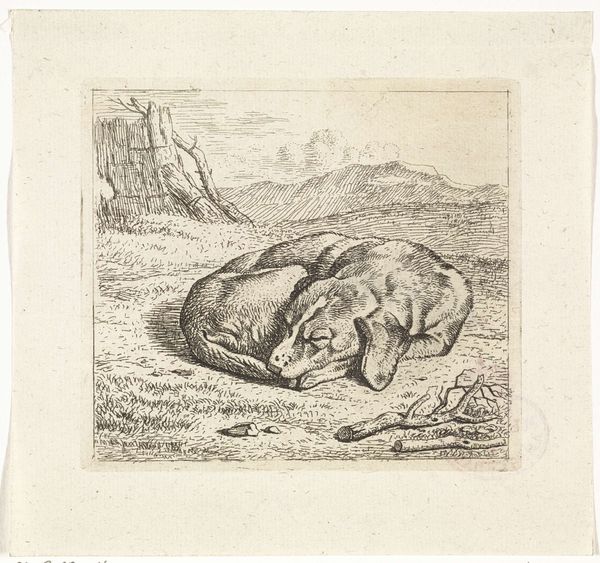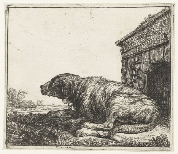 Curator: Fréderic Thédore Faber created this etching titled "Slapende Hond" or "Sleeping Dog" in 1837. It is currently held in the Rijksmuseum collection. My first impression is a sense of melancholy, this isn't just a relaxed creature. Editor: An etching of this scale demands close examination. Note the linear precision Faber achieves, particularly in the dog's fur and the coarse texture of the building behind it. The process is crucial here: the physical act of etching allows for incredibly fine detail. Do you see how Faber exploits this material potential? Curator: Indeed. Dogs are symbols of loyalty and vigilance but here the typical symbolism is subverted. A sleeping dog feels vulnerable, even mournful. Note how the dog's form occupies much of the composition, the foreground texture emphasizing the dog’s proximity to a humble shelter. A strong evocation of reliance. Editor: Absolutely. And this reliance reflects back on the broader context of Romanticism. One recognizes an elevation of humble subjects: a celebration of the rural workforce—often dependent upon these animals. Consider how industrialisation reshaped social relations, prompting artistic focus on simple forms of labor and reliance. Curator: An insightful observation, placing this work squarely in a wider historical conversation about labour and shifting societal roles. We can consider it an idealized version of reliance or even as a melancholic marker of the loss of that idealized condition, don't you agree? Editor: Interesting. This shifts our consideration to broader consumption. Prints like this circulated widely and were not only documents, they were marketable. Faber wasn’t only etching a dog. He was producing a commodity—for perhaps the burgeoning middle class who desired images of sentimental, rural life. The "dog" here becomes the point of transaction, no? Curator: I'd concur that it is likely many meanings layered one upon another, perhaps each of equal measure or prominence. One could argue then, that Faber was acutely tuned to the symbolic and economic currents of his time. Editor: Precisely. Exploring the materials, means of production, and potential consumption expands our perception. Curator: Likewise, considering the artwork’s emblematic weight brings nuance to understanding its meaning, offering broader narratives about shifting historical moods and personal or emotional resonances. Editor: A perfect partnership then to reveal layers in such a piece!