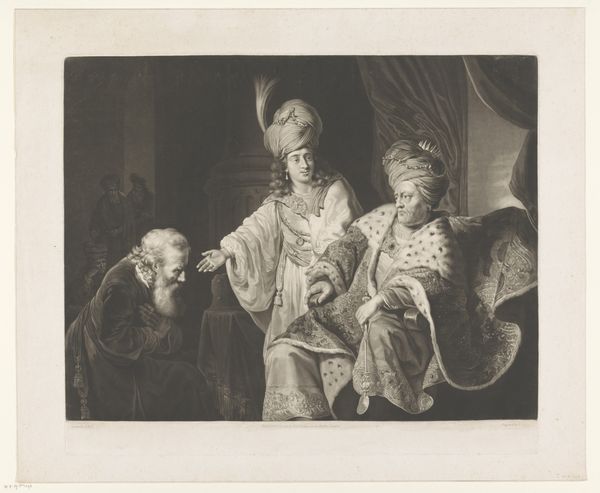 Curator: This is Ferdinand Bol’s “Joseph Introduces his Father to Pharaoh,” created sometime between 1645 and 1652. It's currently held at the Rijksmuseum. We believe the medium is charcoal, possibly with oil pastel on toned paper. Editor: It’s immediately striking – so much drama compacted into this small-ish frame. The subdued colors amplify this air of profound gravity and deference. Makes you wonder what led to this exact moment being captured, doesn't it? Curator: Absolutely. It's fascinating to consider this work through a postcolonial lens. We can analyze the power dynamics in play – Joseph, elevated in Egyptian society, bridging the gap between his family’s heritage and the pharaoh's imperial authority. The act of introduction is layered with cultural negotiation and possibly, a hint of subjugation. Editor: Wow, I hadn’t considered that reading. To me, the figures are compelling—Joseph standing, acting as translator for his kneeling, older, somewhat timeworn father, before this almost Buddha-like pharaoh. I think it’s interesting that this very human, fragile moment, is unfolding within such opulence. You feel it in your bones; everyone wants their father to be respected and admired. Curator: Precisely. The artwork serves as a fascinating intersection of personal and political narratives. Bol is speaking to family structures, yes, but within a larger conversation around power, displacement, and the construction of identity. We see echoes of this in modern migration studies and discussions on diasporic identity formation. The charcoal rendering heightens a sense of tension. Editor: Definitely, it’s not light and breezy, is it? Looking at the image closer now, the figures appear… heavy with meaning, each caught up in their respective roles. Their gaze carries all sorts of weight; pride, uncertainty, calculation… you just know, these familial dynamics can't be contained only to their relationship! Curator: Ferdinand Bol delivers more than a simple biblical tableau; it’s an incisive visual commentary on the enduring human dance for acceptance, power, and belonging. It's amazing that these themes continue to reverberate through history. Editor: The power of art, right? What began as a fleeting glimpse has broadened into something meaningful—offering fresh angles for looking at the world around us, today.