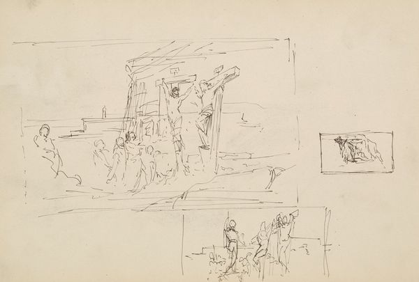 Editor: This is *Battlefield Scenes*, circa 1914-1918, by Charles Hoffbauer, a drawing. It's quite skeletal, more of a series of impressions than a finished work, yet the repetition of figures in action lends it a haunting quality. What do you see in this piece? Curator: The most potent element, for me, is how these fragmented images mirror the fragmented psyche of a soldier experiencing warfare. Each panel seems to trap a memory, a flash of horror, but the overall composition prevents any single event from becoming too overpowering. Do you notice how the eye jumps from scene to scene? Editor: Yes, the separate panels almost feel like snapshots of distinct moments. They create a sense of continuous, yet disjointed, activity. There’s a dreamlike quality because of the sketch-like quality. It feels fleeting, unreal, like the memories are already starting to fade. Curator: Precisely. This fading, or perhaps the attempt to process trauma, speaks volumes. Hoffbauer doesn’t present a glorification of war, but a visual record of the psychological impact, how the mind grapples with horrific events by breaking them down, compartmentalizing them, almost like a ritualistic burial. It asks: How do we memorialize conflict, not just as victory or loss, but as enduring human experience? Editor: That's a powerful idea – that the very incompleteness of the work adds to its meaning. It is about cultural memory not in grand statements, but in fractured whispers. Curator: Yes, it reveals cultural memory through absences as much as presences, which can often be more impactful, inviting the viewer to fill the gaps with their own understanding and empathy. Editor: I hadn't thought of it that way. It really reframes how I see war art in general. Curator: Me too; I noticed new ways of interpreting cultural memory of conflict.