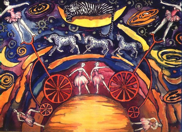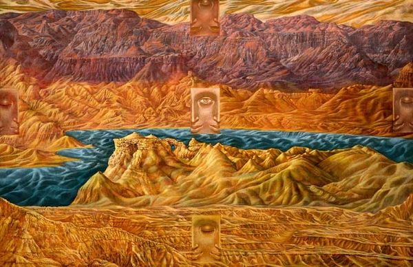 Editor: This is "Le Soleil et les grenouilles" or "The Sun and the Frogs," an oil painting by Carlos Sablón from 2021. The scene is really dreamlike; it feels like you could step right into a fairytale. How would you describe its visual language? Curator: Indeed, its structure presents a fascinating interplay of foreground and background. Notice how the undulating hills lead the eye towards the horizon, yet the foreground elements, with their sharp contrasts, demand our immediate attention. Editor: What's the effect of that contrast? Curator: The painting employs a structured use of light and color. The artist bathes the scene in an almost hallucinatory glow emanating from the sun, positioned just above the blue mountains. The choice of representing frogs in such a grand landscape creates a visual disonance, disrupting our perception of scale and reality. What does this tell you? Editor: I suppose that Sablón seeks to challenge our understanding of form by manipulating perspective and subverting expectations? Curator: Precisely. Sablón prompts a critical reassessment of our habitual modes of visual perception. Its non-traditional juxtaposition invites one to decode this visual landscape. Editor: That's helpful. Now I appreciate that tension between the real and unreal! Curator: A deeper analysis also could decode semiotics through these artistic gestures! Editor: This close look has transformed my view. I initially just saw a landscape; now I see it as a complex formal exercise. Curator: Yes. Paying close attention to form illuminates Sablón’s subversion and manipulation.
