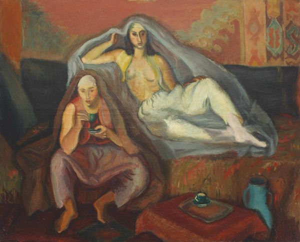 Curator: Balthus's "The Cat in the Mirror," from 1990, is quite intriguing. Painted in oil, it features a young girl gazing into a handheld mirror with a rather self-assured cat perched nearby. What catches your eye first? Editor: The fabrics! Look at the materiality here: a riot of textiles arranged in stacked platforms, from the patterned quilts to the textured pillows and rich velvet coverings. This elevates the domestic and hints at lived-in spaces and skillful hands. Curator: There’s something unnerving about the gaze, isn’t there? That flat affect of both the girl and the cat, staring at their reflections – or perhaps through them. The girl seems on the precipice of adulthood, caught between worlds. There is also a dreamlike, almost surreal quality to the space. Editor: The staging contributes to this mood. Why arrange her in this pile of manufactured things? Note the texture and weight suggested by Balthus's use of impasto paint; it hints at a consumerism beyond mere representation, engaging a haptic experience. Curator: He often painted figures in enclosed, somewhat stifling interiors. "The Cat in the Mirror" brings to mind, for me, ideas of adolescence, self-discovery, but also a sense of being trapped. The mirror serves not just as a surface for reflection but as a kind of portal, perhaps. Editor: This painting reveals more about the circumstances and labor of its creation than it first lets on. Just consider the time it would take to paint each element. Curator: Absolutely, there is time collapsed within this pictorial space; something to really consider, especially, for Balthus. And to think this artwork lives today in a private collection… Editor: Precisely. Its current existence as commodity, framed and valued. Let’s pause to acknowledge this interplay. It deepens how we see its meaning today.