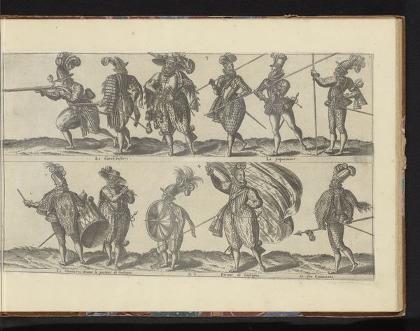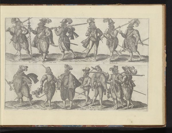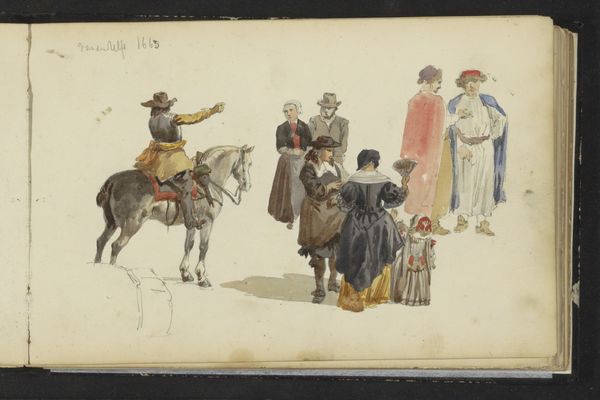 Editor: So, this is Figuren in zeventiende-eeuwse kleding, or Figures in Seventeenth-Century Clothing, a watercolor and drawing by Cornelis Springer, made sometime between 1852 and 1859. It's like a page from a sketchbook, with various figures sketched onto toned paper. There’s a horseman in red and many people on foot...it almost looks like a street scene study. What do you see in this piece? Curator: What I find immediately striking is Springer's engagement with history, and how this work invites us to consider the construction of historical narratives. It's not merely a depiction of 17th-century clothing, but an engagement with how the 19th century viewed and interpreted the past. Editor: Oh, interesting! So, like a commentary on how historical periods are romanticized? Curator: Exactly! Notice the varying levels of detail in each figure. Some are mere outlines, while others are more fully rendered. It speaks to the selective ways we remember and construct history, isn't it? Who is remembered, who is detailed and prominent, and who fades into the background? Do you see any power dynamics being played out here, whether intended by the artist or not? Editor: I see what you mean. The guy on the horse is much more detailed than the beggar with the cane. Maybe it reflects the social hierarchy of the 17th century, as viewed through a 19th-century lens? Curator: Precisely. And Springer's choice of medium - watercolor, a more delicate and ephemeral technique - further emphasizes the fragility and constructed nature of historical representation. It's like he's showing us the act of remembering and imagining a past era. Editor: I hadn't thought of it that way! It's more than just a historical snapshot; it's a commentary on historical storytelling. Curator: Indeed. And considering Springer was working during a period of intense nationalism, it begs the question: how does art shape our understanding of national identity through selective engagement with the past? Editor: I'll definitely be looking at historical paintings differently now, thanks for sharing that.