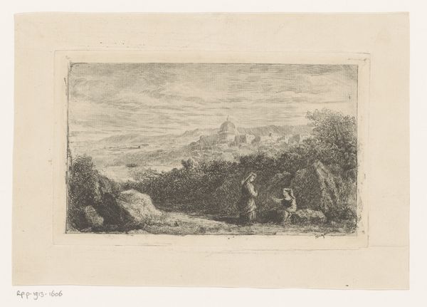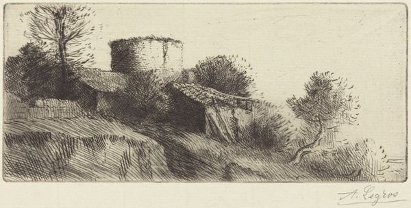 Curator: Here we have "Farm on a Hill" by Alphonse Legros, an etching. What do you make of it? Editor: There's a certain rustic melancholy that washes over me. The intricate linework suggests toil, but the overall muted palette feels peaceful. Almost… lonely? Curator: Legros was deeply engaged in the Realist movement, championing the lives of working-class people. This print echoes Millet's concerns, focusing on the dignity of rural labor. How does this intersect with contemporary discussions around class? Editor: I think about who can access and critique art in places like this museum. There's something profoundly classist about looking from the supposed enlightenment of a gallery to depictions of the peasant class as an 'other.' Are we appreciating, or further alienating and defining? Curator: Indeed, the framing is critical. Legros himself experienced social mobility, eventually teaching at the Slade School of Fine Art in London. It makes me think of art's historical reliance on exploiting the working class' time, talent, and energy. It's a tricky paradox that museums can exacerbate, by both validating some kinds of labor while further enshrining class divides. Editor: This etching medium itself is tied to questions of accessibility, the multiplication and dispersion of images to broader audiences. Though of course even within the sphere of 'popular' images, there were – and still are – profound gaps. And Legros was moving in pretty elite circles in England and France, exhibiting in the Salon. Curator: Absolutely. It urges us to unpack the role institutions played, defining both the access to art-making and to appreciating art in his lifetime. These debates extend right through to our present moment, no? Editor: Certainly, and viewing “Farm on a Hill” becomes, not a pastoral idyll, but a sharp inquiry into visibility, labour and historical power. Curator: Agreed. It’s been very insightful examining these issues with you. Editor: A provocative viewing, thank you.