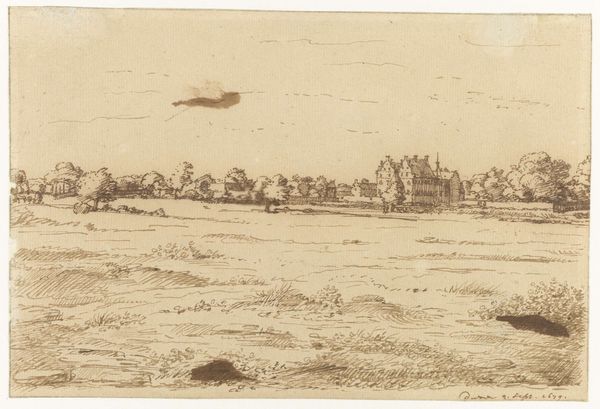 Georges Michel made this drawing using pen, brush and grey wash, likely in the late 18th or early 19th century. The monochromatic palette and the emphasis on the material qualities of the landscape itself – the mud, the ruts in the road – create a sense of immediacy. You can almost feel the weight of the wagons that have passed, the labor involved in moving goods through this rural setting. The drawing isn't just a representation; it’s an index of the physical processes that have shaped the land. The very act of drawing mirrors the labor it depicts. Michel’s choice of humble materials—pen, brush, and wash—aligns with his subject matter. He wasn’t interested in portraying grand historical events or idealized landscapes. Instead, he focused on the everyday, on the grit and toil that underpinned the agricultural economy. It is the intersection of materials, making, and context that gives the artwork its meaning, blurring the boundaries between fine art and the realities of labor and life.