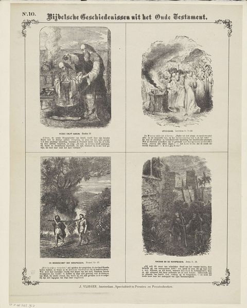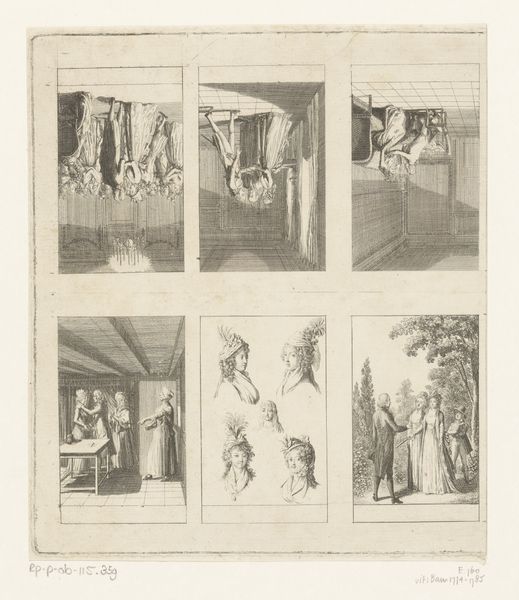 Curator: Here we have Daniel Nikolaus Chodowiecki's "Zes voorstellingen uit de oudere en middelste geschiedenis," a print from 1796, using etching and engraving techniques. Six historical scenes presented on a single sheet. Editor: My first thought is how much detail he managed to pack into these tiny scenes. It's like peeking into miniature worlds filled with drama and whispers of stories long past. Curator: Exactly. Chodowiecki was a master of using printmaking to disseminate accessible narratives. Note how each scene, while small, offers distinct details in costume, architecture, and facial expressions that provided context to a broader audience engaging with history and moral tales. Editor: It makes you wonder about the labor involved. Imagine the patience required to etch those fine lines and capture the essence of a whole scene. You can practically feel the artisan’s hand at work. I find the scene with the figures seated around the table under the vaulted ceiling particularly striking in its intimate scale. Curator: These prints circulated widely, serving as a visual compendium of historical and moral lessons accessible to those beyond the elite. This democratized art consumption is a significant point, considering the historical context of burgeoning print culture. The choice of moments depicted also speaks to the societal interests and values of the period. Editor: It's interesting to consider how the availability of such works shaped historical understanding among everyday people. These little prints acted almost like illustrated textbooks for a wider public. I find a curious beauty in its crude line work, a simplicity that adds to their storytelling power. Curator: Certainly, we appreciate Chodowiecki’s skill and intent. This collection presents accessible visuals shaping a common historical and moral understanding, influencing perception through replicated imagery. Editor: Seeing the collection now, knowing it helped educate many, deepens my understanding. It wasn't just artwork, but a kind of teaching tool, reflecting societal values back to itself.