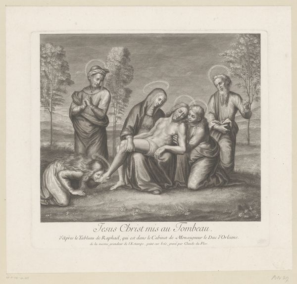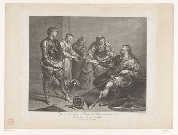 Curator: Immediately, the contrasting groups and the diagonal lines draw the eye into this piece; it feels carefully structured, despite its mundane subject matter. Editor: We're looking at an engraving titled "Mensen en vee bij een bron," which translates to "People and cattle at a well" and it dates approximately to 1766-1774. It appears to present contrasting scenes of rural life, titled below as "Proulium Hollandicum," and "The Flemish farm." Curator: Yes, the bipartite structure is quite clever. The Dutch side is orderly and calm. Look at the placement of each figure, creating triangular forms that lend stability to the left side composition. On the opposing side, we have asymmetry, with people and animals crowded. Editor: The contrast could represent the divergent views and perceptions of rural life in Holland versus Flanders during the late 18th century. Holland, at the time, had a more centralized and ordered approach to social structures and perhaps they wanted to project this image of peace and stability. This contrasted greatly with the political upheavals and wars ravaging Flanders. Curator: You’re right. And the light! It enhances the orderly appearance of the left group versus the implied chaos of the opposing scene. Look how the artist utilizes cross-hatching, dense and varied to denote darkness versus clear, minimal applications denoting light. It all contributes to the visual effect. Editor: We cannot discount the historical context either. The engravings such as this, during the 18th-century, frequently romanticized pastoral scenes as commentary on or even an escape from increasingly urbanizing landscapes. Curator: Indeed. Yet I cannot help but notice the strong visual relationship between all figures, irrespective of sides. Observe how poses are mirroring between figures. Editor: It would seem, perhaps the contrast exists merely on a superficial level, and that deeper understanding reveals their interdependence. Even divided societies are interconnected and their social fabric shares universal attributes, regardless of specific region. Curator: A potent observation. These visual echoes almost suggests something less divided… Perhaps we initially interpret the composition as opposing elements when it reflects something more unified than disparate, a reflection of inherent artistic expression itself? Editor: Precisely. A dual commentary, at first about two places, ending up in unity about mankind through art. Fascinating.