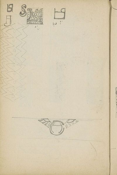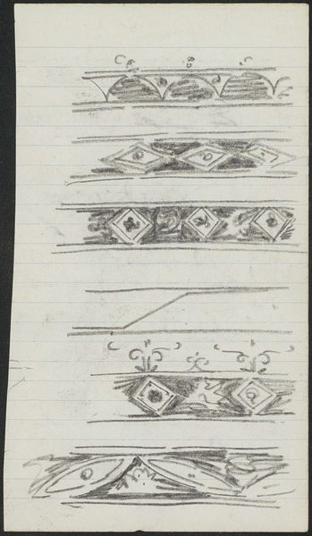 Editor: This is "Ornamenten, onder andere met ruiten en stippen," or "Ornaments, including diamonds and dots," a drawing in ink on paper by Gerrit Willem Dijsselhof, dating from around 1876 to 1924. It feels very preliminary, like a study for something larger. What can you tell me about this piece? Curator: It’s fascinating how Dijsselhof, positioned within the Art Nouveau movement, engages with ornament. We must consider the historical context: late 19th and early 20th-century Europe, a period grappling with industrialization and anxieties about the loss of craft traditions. How does this drawing function as a response to those societal shifts? Editor: I hadn't thought about that! Is Art Nouveau, then, a sort of… rebellion? Curator: Absolutely. Consider Art Nouveau's emphasis on organic forms and handcrafted aesthetics as a direct counterpoint to the mass-produced, often dehumanizing, nature of industrial goods. Look closely at the geometric patterns Dijsselhof employs. What feelings or associations do they evoke for you? Do you think this relates to his wider identity? Editor: They feel almost… primitive? There’s a simplicity to them, but also a potential for complexity if repeated. Perhaps it represents how the simplest visual vocabulary can have near-endless permutations, mirroring how people navigate a society? Curator: Precisely. It’s about the artist grappling with their cultural inheritance while simultaneously seeking to forge a new visual language that speaks to contemporary concerns and is representative of identity. It prompts us to question the role of ornament itself: is it merely decorative, or can it be a powerful vehicle for social and political commentary? Editor: I see it now, especially connecting the focus of Art Nouveau to his personal story. This was really eye-opening! Curator: And that, in turn, opens a richer dialogue with our own time, and how we continue to grapple with these issues of production, identity, and cultural expression.