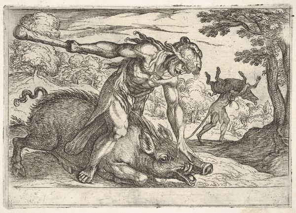 Curator: So, here we have "Hercules Fighting the Nemean Lion," an engraving made by Albrecht Altdorfer sometime between 1500 and 1538. Editor: Whoa, it's intense! Even in this tiny format, you can feel the struggle. There’s something almost claustrophobic about the way the figures fill the frame, all teeth and claws and straining muscles. Curator: Indeed. Altdorfer, known for his landscape work, employs incredibly dense lines here. Notice how he uses the engraving technique to create varied textures, distinguishing the hero’s skin from the lion’s fur and the rocky ground. It’s fascinating to see how he translates form into purely linear terms. Editor: And he's captured the ferocity perfectly. Hercules looks almost animalistic himself, mirroring the lion's aggression. It’s as if the act of battling such a creature transforms him. Did Altdorfer mean to convey some sort of blurring between man and beast? Curator: It's a possibility. The context is important. These prints were relatively accessible, meaning the tale of Hercules became a commodity in a sense. Altdorfer’s artistic labor translates into the broader dissemination of this mythological narrative. Also note Hercules’ weapon – the bow – laying unused, suggesting hand-to-hand struggle, maybe an echo of man's relationship to nature or its subjugation. Editor: Absolutely. Looking at it again, that bow and those unused arrows, that actually humanizes Hercules and makes me wonder, what does this small, intensely wrought piece say about our relationship to beasts we must fight or overcome? Even within ourselves, maybe. Curator: A great point. Altdorfer delivers the human and more material dimension, the heroic struggle. Editor: Yes, a brutal miniature world captured in lines. Definitely gives one pause.