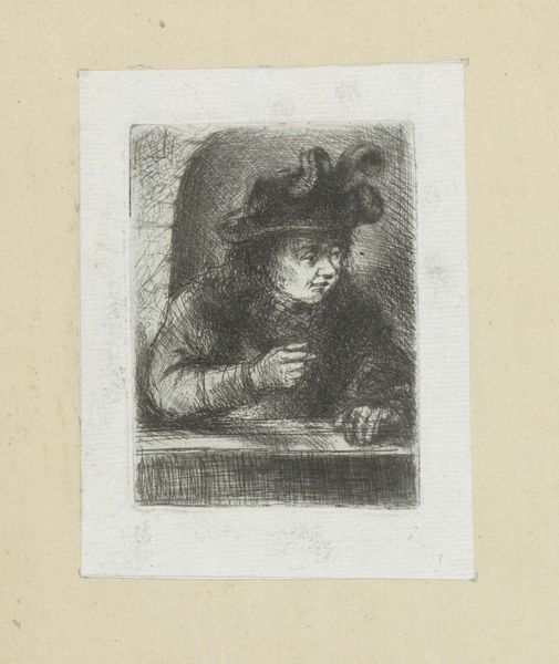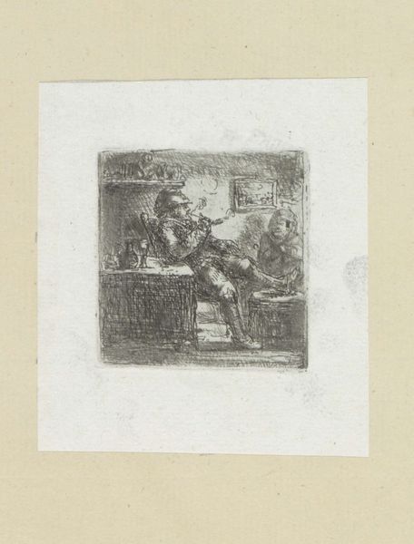 Curator: We're looking at "Man at the Dinner Table," an etching crafted around 1802 by Jan Chalon. It presents an intimate glimpse into daily life through delicate lines and a muted palette. What's your first take? Editor: Intriguing! I'm drawn to the overall feeling of enclosure, almost isolation, emanating from the etching. The man seems utterly consumed by his meal. The texture, almost chaotic with dense strokes of pencil, conveys some intensity. Curator: Yes, the hatching technique employed for shading contributes to that sensation. Observe the subject's fur cap, its lines mimic swirling thoughts within the skull. He seems preoccupied and detached from whatever might be occurring around him. Note too how the etching teeters stylistically on the border of genre and portrait art. Editor: Precisely. There's a compelling immediacy in the portrait’s style, as if captured candidly. The dark areas heighten the impression of him being enveloped in shadow, but also, quite brilliantly, they direct the viewers eye towards the middle and the focus area, the table with dishes and bottle. What strikes me is also the presence of what appear to be statuettes on the upper shelves, perhaps mocking and observing the whole dining scene. Curator: An interesting take. That would fit Chalon’s humor, in my perspective, an artist with such skill with a print to spend his time painting this kind of domestic scene has to carry in it the key to a sardonic way of judging and laughing at this time in life, in such times. Editor: Indeed, a perspective amplified by the rather rough quality of the homemade paper itself; its very texture infuses the piece with raw, unassuming authenticity. It adds an unpretentious depth, which mirrors the subject's grounded, somewhat coarse existence. The lines of aged paper blend in perfectly in this tableau. Curator: True, and that roughness juxtaposes against the relative delicacy of the etched lines, intensifying the image's intimate, somewhat melancholy air. He's truly an unspectacular common person, presented in the most spectacular possible light due to its high fidelity and artful detail. Editor: Exactly. Chalon manages to render something rather beautiful and complex from something so mundane. The piece stays with you; a silent character study and I will wonder who he was long after I turn from this artwork.
