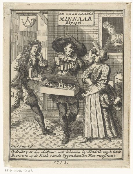 Editor: So, here we have "A Pewterer and a Young Woman," an engraving probably made between 1650 and 1674 by an anonymous artist. I'm struck by the crispness of the lines and the almost photographic detail in the clothing. What do you see as the most important aspects of its visual structure? Curator: Immediately, the bilateral symmetry commands attention. The composition cleaves neatly: male and female figures balanced on either side of the vertical axis. Note how this mirroring isn't perfect; the implied movement of each figure disrupts any static reading. Consider, too, the textural variations—the dense hatching used to define volume against the comparative lightness used in areas such as the woman's dress. Editor: That's a great point about the asymmetry. The direction of the figures' gazes really animates the image. How does the relationship between the figures influence your reading of the work? Curator: It's a curious pairing. He gestures, she reciprocates. Do we see genuine exchange or mere posing? Observe their hands: the man holds his hat low; the woman holds her skirt high. They use their garments almost like symbolic cues in a constructed theatrical production. Do you find any spatial depth within the pictorial plane, or are they posed almost as a relief on the surface? Editor: I hadn’t considered it as theatrical, but I think I agree! Now that you mention it, they do look a bit like actors on a stage, with that building forming the backdrop. Thanks, I’m viewing it in a new light now. Curator: Indeed. It's the meticulous organization of visual elements that ultimately yields deeper meaning in art.