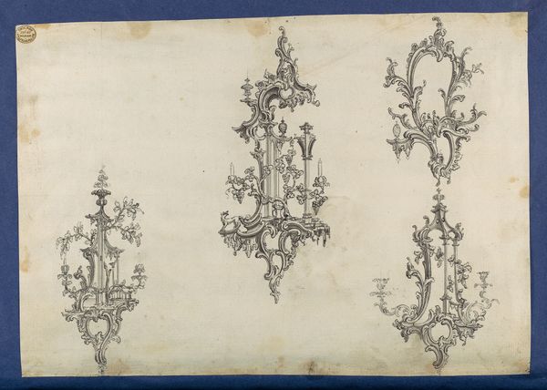 Editor: This is Thomas Chippendale's "Candle Stands, in Chippendale Drawings, Vol. I," from 1753. It’s a drawing, likely pencil and print on paper, showcasing three different candlestick designs. They feel incredibly ornate and give a glimpse into the aesthetics of the time. What does this piece communicate to you? Curator: It speaks volumes about the intersection of art, craft, and social status in 18th-century England. Chippendale was more than just a furniture maker; he was a tastemaker. These drawings weren't just sketches; they were part of a catalogue, a sales tool designed to appeal to a burgeoning middle class eager to emulate aristocratic tastes. How do you think designs like these affected domestic life at the time? Editor: I imagine it created a kind of aspirational culture, influencing how people decorated and presented their homes, even if they couldn't afford the most elaborate versions. Did Chippendale directly make all these pieces? Curator: Probably not himself. His workshop employed many artisans. Chippendale was the creative director, so to speak, establishing a visual brand, which made his work highly sought after. He tapped into the desire for neoclassical elegance. How do you see that reflected in the drawings themselves? Editor: Well, I see a lot of symmetry and balance, with those delicate, curving lines that suggest classical motifs, but also feel incredibly unique. It shows how design became another method for a rising merchant class to publicly display its economic accomplishments. Curator: Precisely. And it shows how objects within the domestic sphere became politicized through displays of economic means. It's not just about beauty; it's about social positioning and solidifying cultural norms. Editor: I never thought of furniture design as a way of understanding societal power dynamics! Thanks for broadening my perspective on this. Curator: My pleasure! Considering design as an influencer and tangible form of cultural ideas gives us insights into the politics of everyday life.