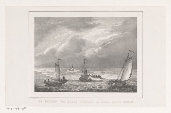Curator: Welcome. Before us is "Stoomboot en zeilschip tijdens een storm in een haven," a print, more precisely an engraving, made sometime between 1822 and 1845 by Carel Christiaan Antony Last. Editor: Wow, what a tumultuous scene! Even in monochrome, you can feel the raw power of the storm, right? The way the waves are rendered makes me want to grab onto something. It's wonderfully chaotic. Curator: Indeed. The composition strategically contrasts the emerging industrial age, embodied by the steamboat, with the traditional sailing vessel, all set against the backdrop of nature's overwhelming force. Note the tonal range; it suggests both depth and impending darkness. Editor: That steamboat looks like it’s having a rough day. It’s amazing how the artist captures the precariousness of human endeavor against the sheer dominance of the natural world. I almost feel seasick just looking at it. A tiny ship versus towering waves... dramatic. Curator: The artist masterfully employs chiaroscuro, using stark contrasts of light and shadow to amplify the drama, evoking an emotional response consistent with Romantic ideals. The cityscape provides context, highlighting mankind's vulnerability in contrast to the power of nature. Editor: Right! Like, "we built this pretty port, aren't we clever?" says humankind, as the storm laughs hysterically. I love how the people on the dock are just watching—powerless. The scene just resonates with that slightly fearful excitement of watching something overwhelming unfold from a (relatively) safe distance. Curator: And isn't it fascinating how the stylistic rendering borders on historical painting? Even though it depicts a specific scene, there's a sense of universal narrative—man versus nature, tradition versus progress. The themes embedded in this image are almost biblical. Editor: Totally. There’s definitely an epic quality about it. A storm at sea, captured with such feeling and skill...makes me think of all those dramatic sea stories—full of peril and the fight for survival. I wouldn't want to be on either one of those ships right now. Curator: A valuable point that underscores the artwork’s successful orchestration of formal elements to express grand, romantic sentiments. Editor: Right, it's much more than a simple seascape; it's a whole opera of dark waves and dramatic ships, all caught in ink. And now, if you’ll excuse me, I think I need some ginger ale.