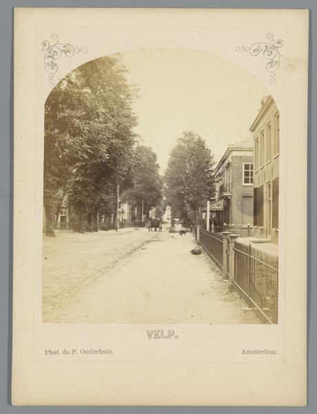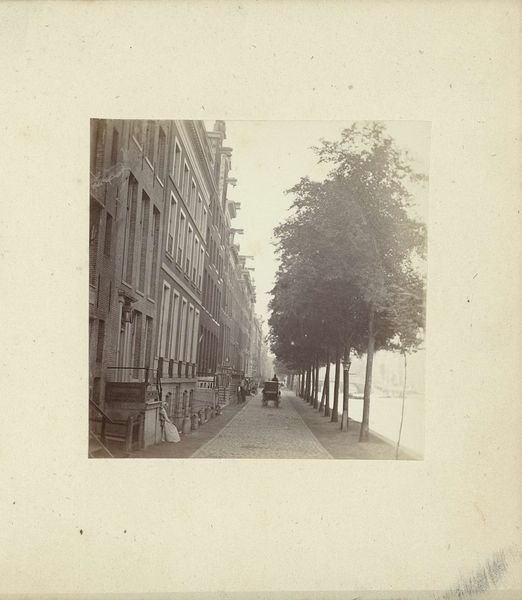 Editor: Here we have Pieter Oosterhuis' "Huizen aan de Rijnkade, Arnhem," a gelatin silver print, created sometime between 1867 and 1885. It has such a quiet, almost stately mood to it. I'm immediately drawn to how the trees line up, creating a vanishing point. What’s your take? Curator: What strikes me is how this image documents a burgeoning sense of civic pride in urban spaces, especially during a period of significant social and economic change in the Netherlands. This photograph presents us with a cleaned up, idealized vision of city life. Notice the clarity and how it suggests a striving towards order and progress, which were popular ideals in the burgeoning middle class of the late 19th century. How does the absence of overt social commentary or working-class presence speak to the intended audience? Editor: That's interesting, it does feel very staged in a way that promotes that image of order. The light seems very gentle; I suppose it romanticizes the city in a way that also omits part of the picture, maybe? Curator: Exactly. And think about how this photograph would be received. It reinforces certain power structures through its framing and chosen subject matter. Photography at this time was increasingly accessible to a wider audience, shaping their perception of the ideal cityscape and implicitly excluding the less palatable realities of urban life. Do you agree with the social implications, or could it simply document an existing order? Editor: I see what you mean. It's a manufactured reality more than an objective one, almost a piece of propaganda. Curator: Precisely. It encourages us to think critically about whose vision of the city is being presented and for what purpose. Editor: Well, that’s given me a totally different view on it; the role it played is clearer now. Curator: Indeed, exploring these socio-political angles can really enrich our understanding of seemingly simple photographs.