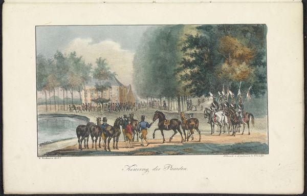 Editor: Here we have James Pollard's "Saint Albans Grand Steeple Chase," materials include colored pencil and print on paper. It has this feeling of open air, and the way the riders are lined up makes me wonder about how horse races were seen as forms of spectacle and entertainment for the elites. What aspects of its production stand out to you? Curator: Absolutely. Note the printmaking process itself. Consider the labour involved in creating multiple identical images, disseminating this scene of elite leisure to a wider audience, yet still consumed, obviously, by the bourgeois class. It’s no coincidence that colored pencil is used—it cheapens and almost 'crafts' the 'fine art' print tradition. How does that cheapness shape our understanding of its intended audience and its social purpose? Editor: So, the very means by which the image was produced informs its status as something perhaps not quite 'high art'? Almost blurring boundaries. Curator: Precisely! This isn’t just about aesthetics or pure artistry. Look at the materiality itself—the paper, the coloured pencils. They’re all manufactured commodities tied to specific economic and social conditions. This makes you ask important questions about what work gets valued and why, doesn't it? Editor: It really does. It sort of puts a new layer to the understanding of ‘art’. It's about how everything is related - its existence and audience included - and where this 'fits' within society! Curator: And understanding how "high art" can, through reproduction and accessible materials, filter down and become a widely circulated commodity itself is a major point. That changes the art!