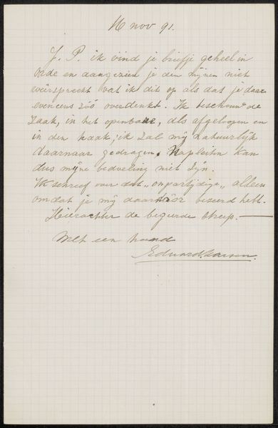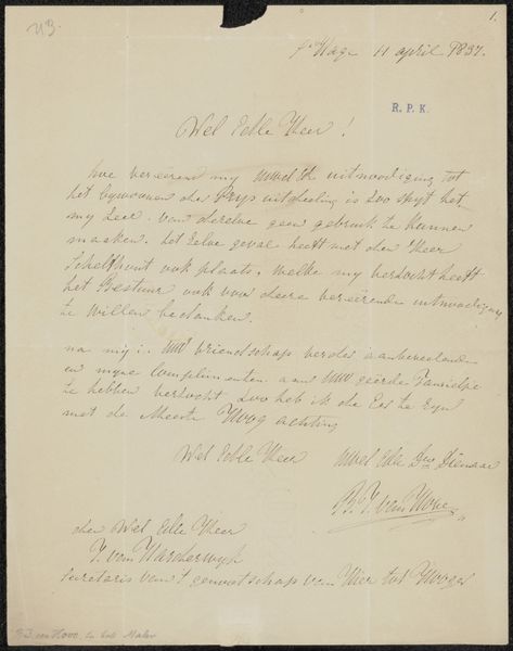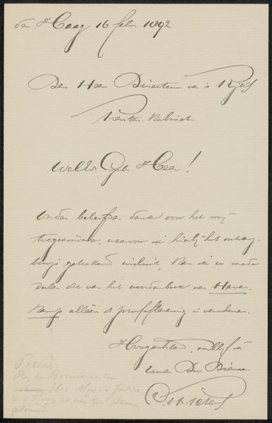 Curator: Here we have "Brief aan Mien Cambier van Nooten" – that’s "Letter to Mien Cambier van Nooten" – possibly from 1937, crafted by Juliana Christina Ket-Otten. Editor: My first impression is one of delicate intimacy. Look at that handwritten script – so fine, yet determined. It conveys such a personal sentiment, doesn’t it? Almost fragile. Curator: Indeed. The letter itself acts as a vessel, conveying cultural values through an intimate and expressive voice. It speaks of gratitude and connection, timeless human experiences. The act of writing itself is almost ceremonial here. Editor: I’m fascinated by the material reality of the letter. You have to consider the specific ink, the quality of the paper. Was it everyday stationary, or was it especially selected for the recipient? This dictates its availability but it adds layers to the meaning. It shows you its place within an economy of materials, access, and exchange. Curator: The ink, now faded slightly, would have originally appeared as a rich, dark tone creating contrast between paper and image. Its hand drawn typeface evokes the intimacy of a personal message over standardized type. The way that the forms connect shows a fluidity between letterer and recipient. Editor: The physical labor involved, the act of sitting down and carefully forming each word, highlights a dedication of the process, I am also drawn to think about labor conditions, like lighting. It creates its own emotional weight; a contrast to mass produced items like typewritten or printed messages. The difference lies here between functional versus expressive intent. Curator: Precisely. And consider, too, the L.O.L at the bottom... an ancestor of the modern internet acronym, but now appearing like ancient and encoded lettering with cultural history folded into the text. It prompts curiosity about their relationship and hints at a more carefree element undercurrent within its conventionality. Editor: In that sense, examining a letter like this allows to consider relationships beyond purely aesthetic; we can reveal intimate details about a historic material practice of communication and handwork – from sourcing materials to physical production as an alternative to technological change. Curator: So beautifully put. This drawing is so much more than ink on paper. It is memory and relationship brought to light by its graphic touch and its very personal human contact. Editor: Yes, and hopefully that consideration transforms the way we relate to both artistic and handmade output today.