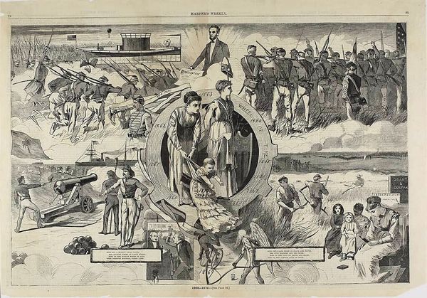 Editor: This is "The Songs of the War," possibly from 1861, by Winslow Homer. It's an engraving printed on paper. It feels like a complex, almost overwhelming collage of different scenes related to the American Civil War. What story do you see being told here? Curator: It's funny you say "overwhelming" because that's precisely what strikes me too! It's as if Homer wanted to capture the dizzying array of emotions, experiences, and even propaganda swirling around the conflict. Look how he juxtaposes scenes of marching soldiers with musical instruments and lyrics—'The Bold Soldier Boy', 'Glory Hallelujah'… even 'Dixie'. Editor: Yes, the sheet music! The inclusion of "Dixie" seems almost… discordant given the context of the war. Was Homer trying to be neutral, or make a statement? Curator: Precisely! Was it an attempt to acknowledge the pervasive culture of the South, or an ironic commentary? The beauty of art, my friend, lies often in the ambiguity, isn't it? Homer provides a chorus of images without offering a singular resolution, a feeling of chaotic tension. Doesn't that mirror the war itself, this cacophony of divided loyalties? Editor: I suppose it does. I was expecting something grand and heroic, and instead I find this kind of… organized mess. I find the contrast almost poignant, now. Curator: And perhaps that messy complexity is far more honest and moving than any idealized vision could ever be. That's where I find the art--within the grey, fuzzy and contradictory in its expression.