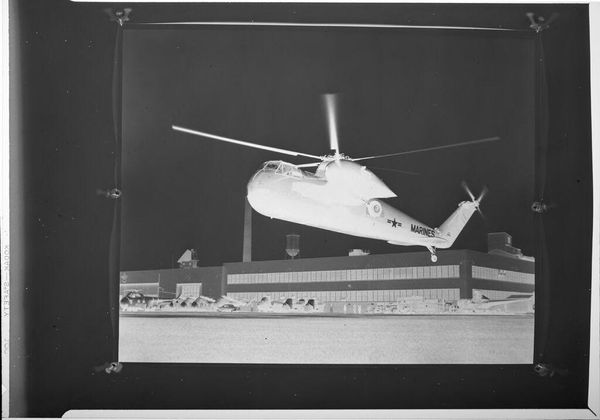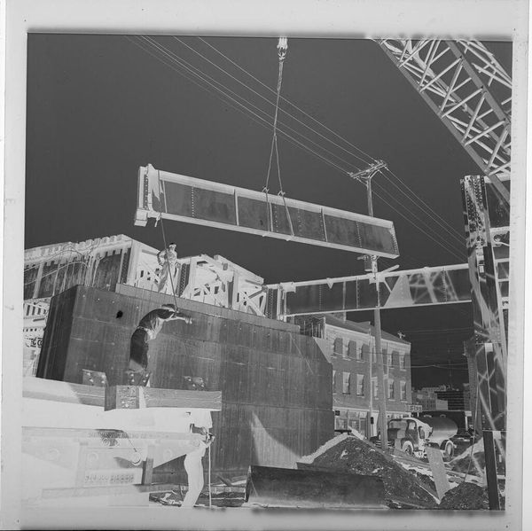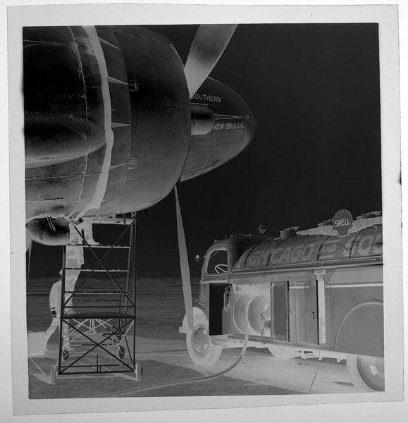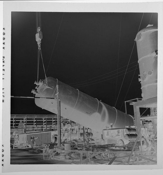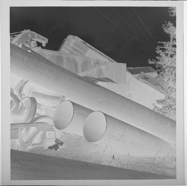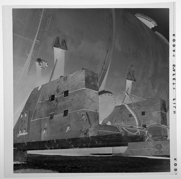 Curator: This is an untitled photograph by Jack Gould, currently held at the Harvard Art Museums. It depicts men working in front of a very large tank. Editor: The inversion of the image throws me off initially, but the composition, with its strong diagonals and the sheer scale of the tank, creates a powerful sense of industrial might. Curator: Indeed, the photograph, though small, speaks to the labor involved in such industrial processes. Consider the material context: What kind of labor relations are present? What impact does heavy industry have on the environment in the port? Editor: But look at the tonal range, the stark contrast between the workers and the colossal structure they attend. The photograph becomes an abstract study of form and light, almost oppressive in its scale. Curator: It's a compelling visual record. The reversed image and visible Kodak markings on the film edges also reveal the process and materiality of photography itself. Editor: Quite right. By isolating these workers and their task, Gould invites us to consider the relationship between the human and the monumental, rendered with such dramatic visual flair.