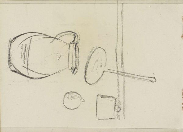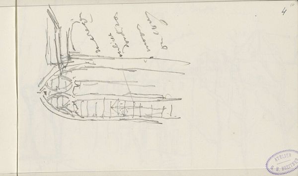 Curator: Before us we have "Architectuurdetails," a pencil and pen-ink sketch created around 1896 by Carel Adolph Lion Cachet. It's currently held here at the Rijksmuseum. Editor: Immediately, I see a deconstruction. The sketch has a fractured, almost dreamlike quality—familiar architectural components rendered strange, weightless. It disrupts any traditional notion of form or function. Curator: Indeed. Look at the paper itself. The texture indicates it was part of a personal sketchbook, a space for the artist's preliminary ideas. It shows the process, the raw labor that birthed the artist's vision. This brings us closer to Cachet's design and thought process, challenging the myth of the singular artistic genius and bringing awareness to the social condition of art production as an evolutionary process. Editor: The geometrical components seem to float independently; there's an interplay between positive and negative space which keeps it engaging despite the absence of traditional shading. Notice how the linear qualities create implied shapes which create balance. Curator: Precisely! It is likely that it was used for idea generation and documentation rather than an artistic goal. Consider the social and material conditions: What resources were available to him? What sort of commissions was he working on concurrently? We see not just artistic intention, but also the potential limitations and possibilities shaped by broader economic and societal forces. Editor: But to divorce it completely from aesthetic value would be amiss. The suggestive forms and ghostly lines invite subjective interpretation. How do the fragmented lines communicate a mood? What happens if we emphasize certain elements or rotate the artwork? There’s freedom in its incompleteness. Curator: I concede that it does provide creative opportunity for viewers, allowing subjective thought about material history and means of production, therefore democratizing art analysis, de-centering the authority traditionally invested in finished artworks. I do believe it offers an entry point to the complex labor and choices involved in artmaking, offering an important counternarrative in a museum filled with often polished and seemingly effortless works. Editor: Perhaps what’s most striking, ultimately, is the work’s invitation to pause and reconsider, regardless of context, what constitutes an ideal, aesthetically, as each line plays against the others.