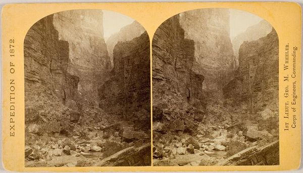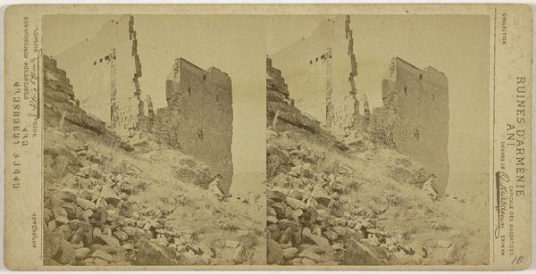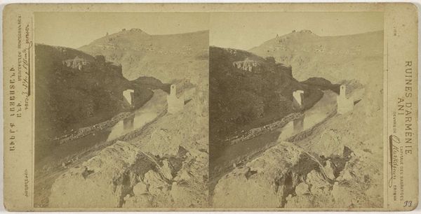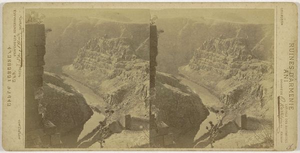 Curator: This gelatin-silver print, dating from sometime between 1875 and 1880, captures the "Klooster van de Maagden, Ani" or Convent of the Virgins, Ani. It's attributed to Onnes Kurkdjian. Editor: The stereoscopic effect here emphasizes the textures—the jagged stonework, the cliff face, everything feels worn down by time. It certainly evokes a mood of isolation and melancholy. Curator: Yes, the crumbling architecture of Ani speaks volumes. Once a vibrant medieval city, Ani held significant power as the capital of a large Armenian kingdom. Its demise underscores Armenia's turbulent history, marked by successive waves of invasions and cultural erasures. This image documents the orientalist fascination of the time, especially towards ruins. Editor: I'm immediately drawn to the formal structure. The strong diagonal lines create depth, and the contrast between the sharp, angular remains of the monastery and the organic forms of the surrounding landscape adds an interesting tension to the work. The limited tonal range in this monochromatic picture further reduces any sense of temporal context. Curator: Absolutely, and the location on the edge of a gorge likely provided some physical safety to the convent, while at the same time reflecting the limited options available to the Armenian people when making their home. Considering the photographic technology of the time, it’s interesting to examine what he chose to depict, versus the other ruins within view. The choice reflects certain ideas regarding power. Editor: Kurkdjian's strategic placement of the camera allows us to see all the forms within the frame without much clutter, while the stereoscopic view offers a type of visual haptic quality. This work certainly demonstrates how even historical photography benefits from this dual treatment, making the ruins tangible and seemingly within our reach, bridging that chasm of time itself. Curator: Seeing Ani through Kurkdjian's lens gives insight to that place as well as this period's views toward it, a reminder of Armenia's long and often painful journey through history. Editor: And for me, it’s a powerful case study in using photography to engage and reflect on how architecture—or what remains of it—can become symbolic in both form and placement.